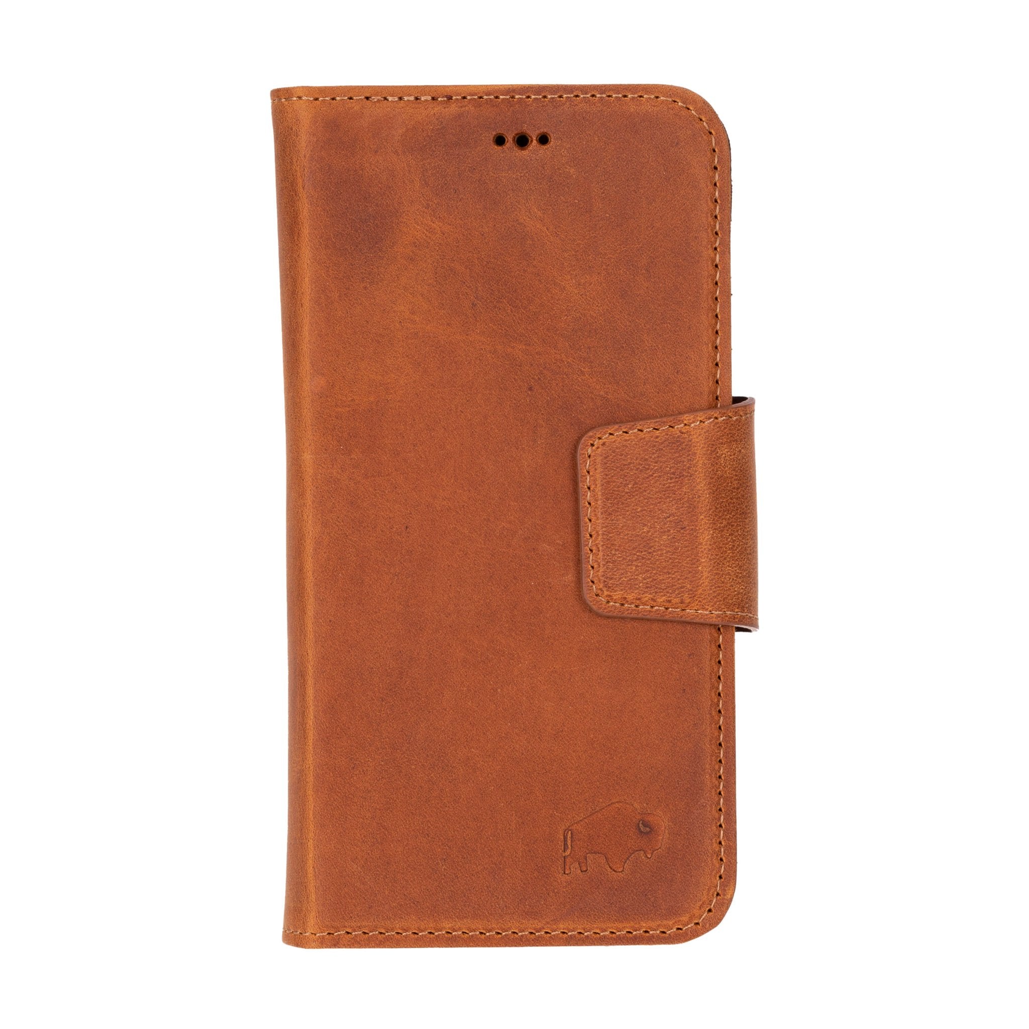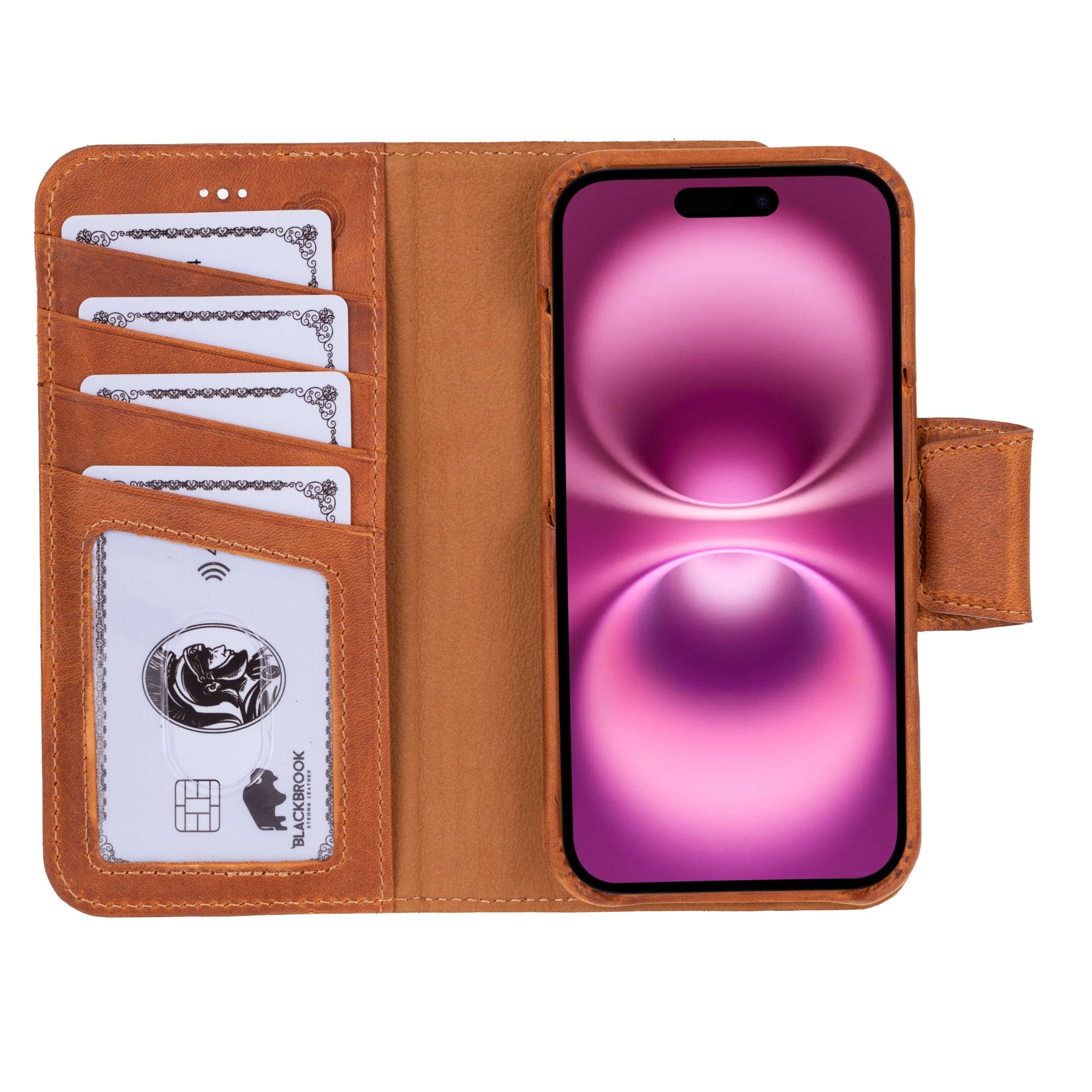 2-in-1 full-grain leather wallet case for iPhone 16 with a detachable snap-on phone case. Designed for everyday carry with built-in card storage and screen protection.