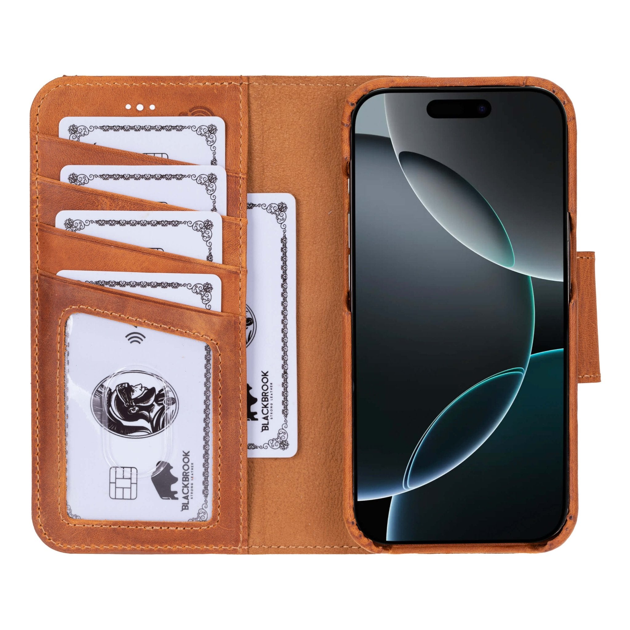 2-in-1 full-grain leather wallet case for iPhone 16 Pro with a detachable snap-on phone case. Designed for everyday carry with built-in card storage and screen protection.
