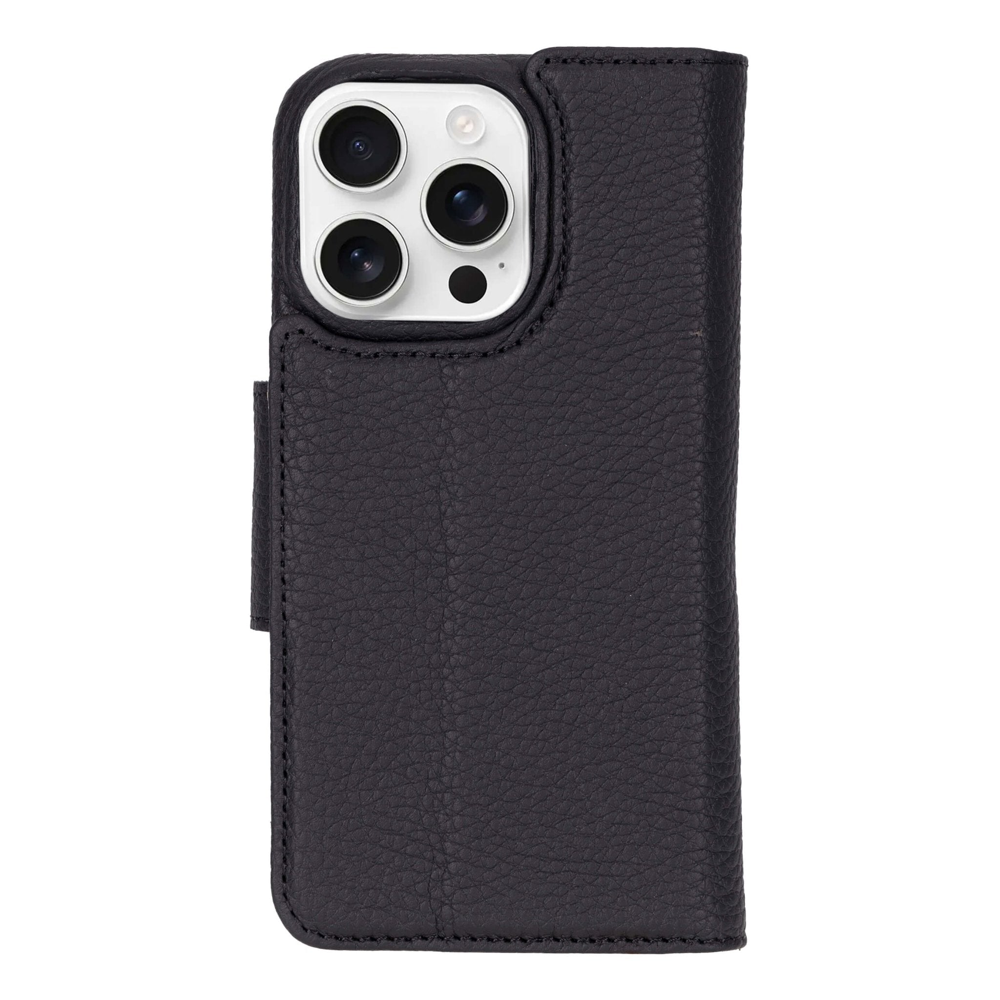 2-in-1 full-grain leather wallet case for iPhone 16 Pro with a detachable snap-on phone case. Designed for everyday carry with built-in card storage and screen protection.