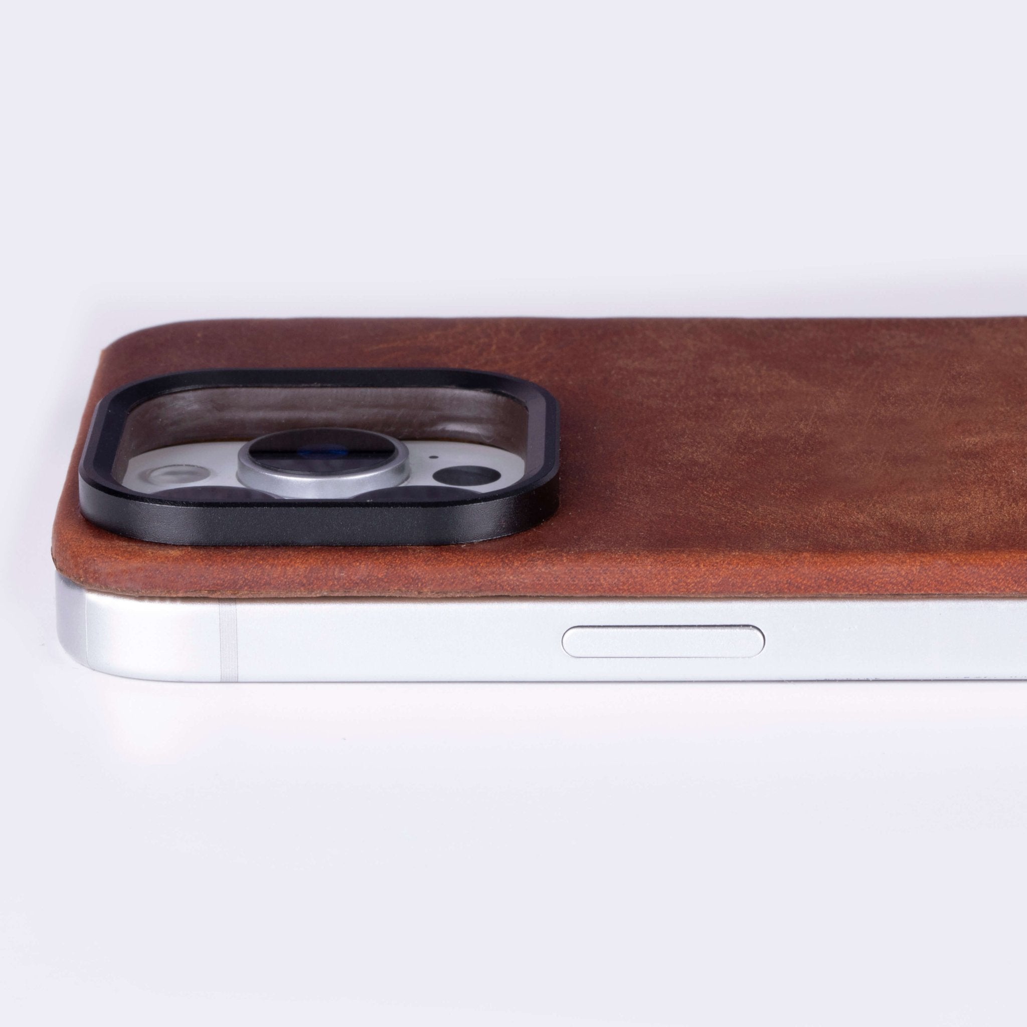 Ultra-thin full-grain leather back case for iPhone 16 Pro Max with MagSafe compatibility and a raised metal camera ring. Designed to add discreet protection while preserving the iPhone’s original feel.