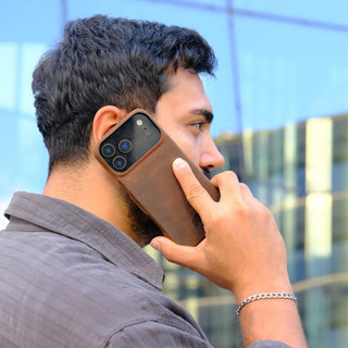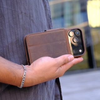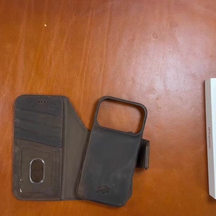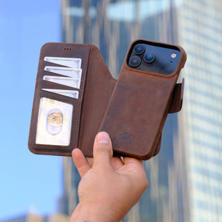 A handcrafted 2-in-1 wallet folio made from full-grain leather. Secure snap-on phone case pairs with a magnetic card holder for everyday carry. Built for protection, designed for convenience.