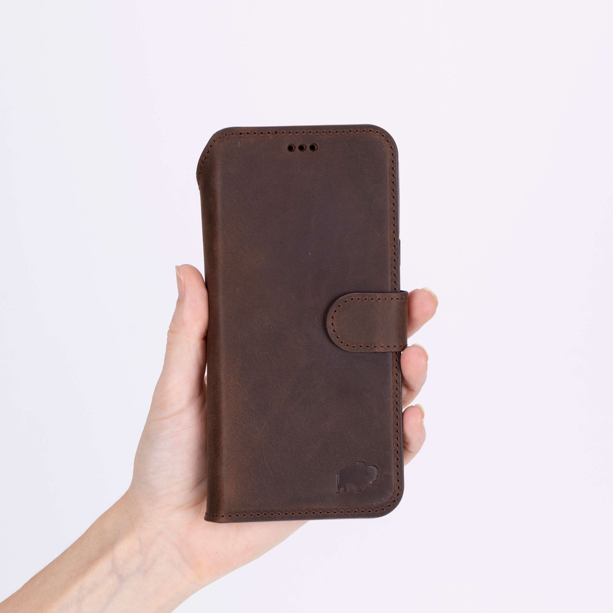 Stylish, 2-in-1 magnetic detachable wallet case. Full Grain Leather. Keeps essentials organized and protected.