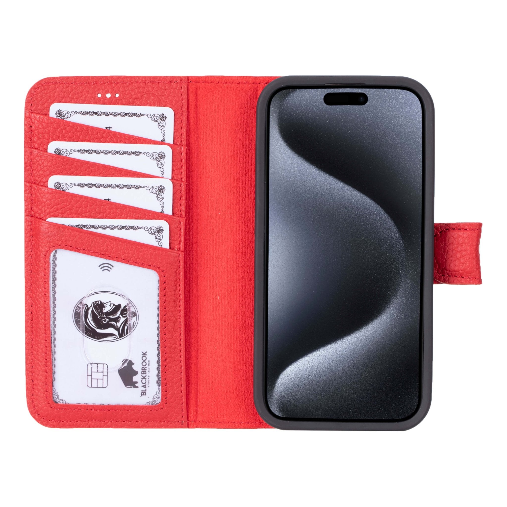 2-in-1 detachable leather wallet case for iPhone 15 Pro Max with a hybrid snap-on phone case. Designed with reinforced TPU sides for added drop protection and everyday carry convenience.