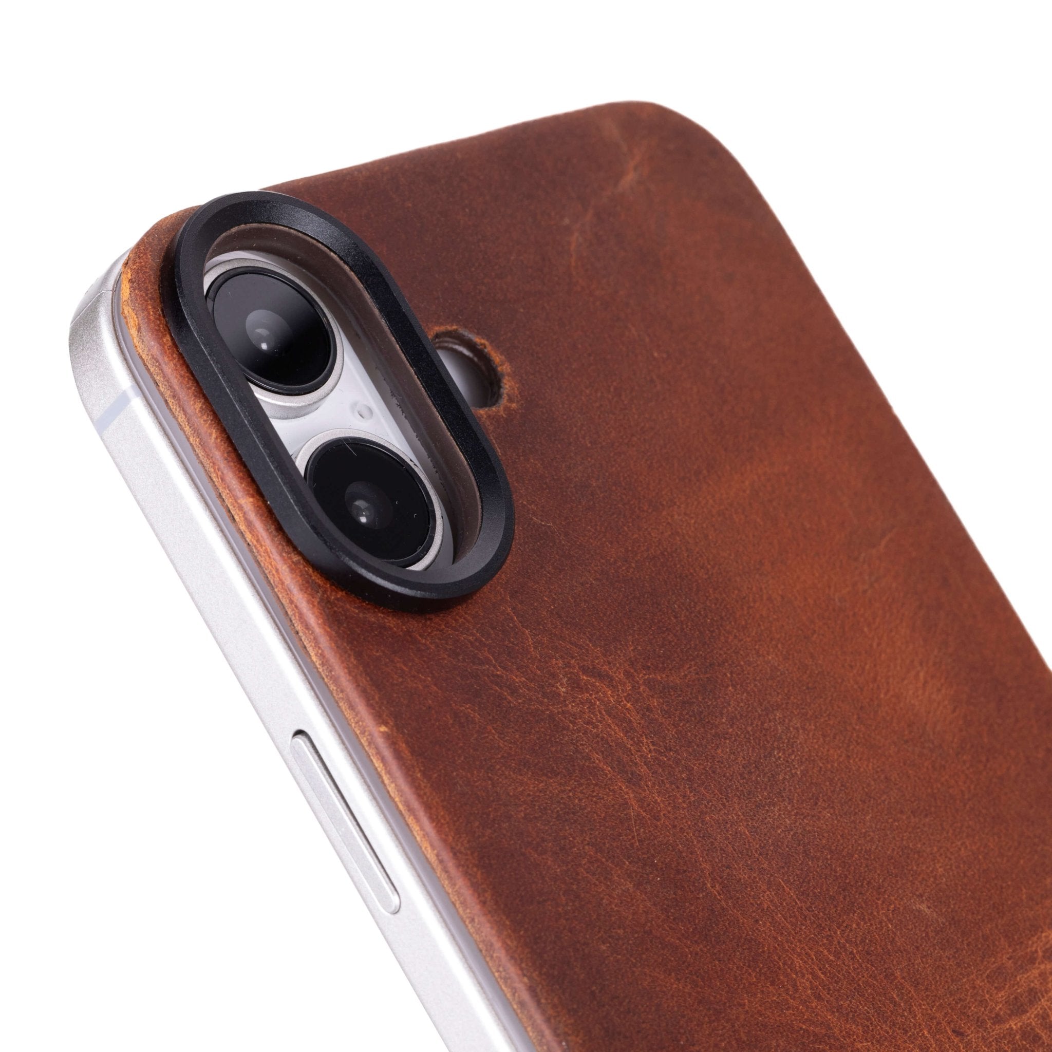 Ultra-thin full-grain leather back case for iPhone 16 with MagSafe compatibility and a raised metal camera ring. Designed to add discreet protection while preserving the iPhone’s original feel.