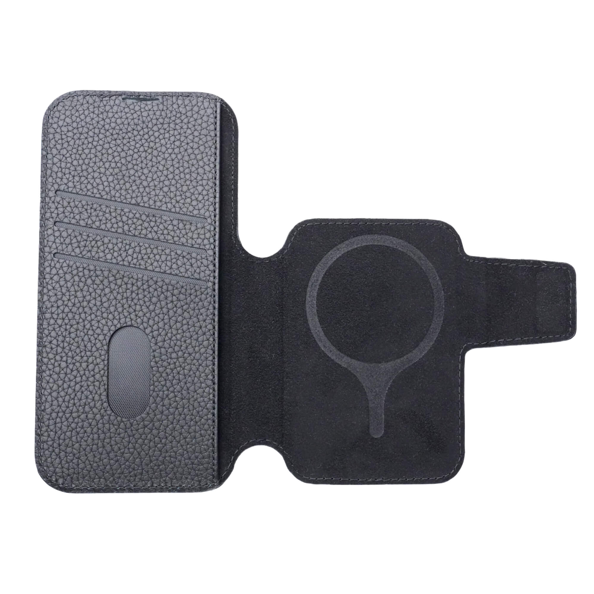 Slim one-piece full-grain leather magnetic wallet designed to attach directly to your iPhone 17 Pro Max or pair with our snap-on case system. Built for essential carry without bulk.