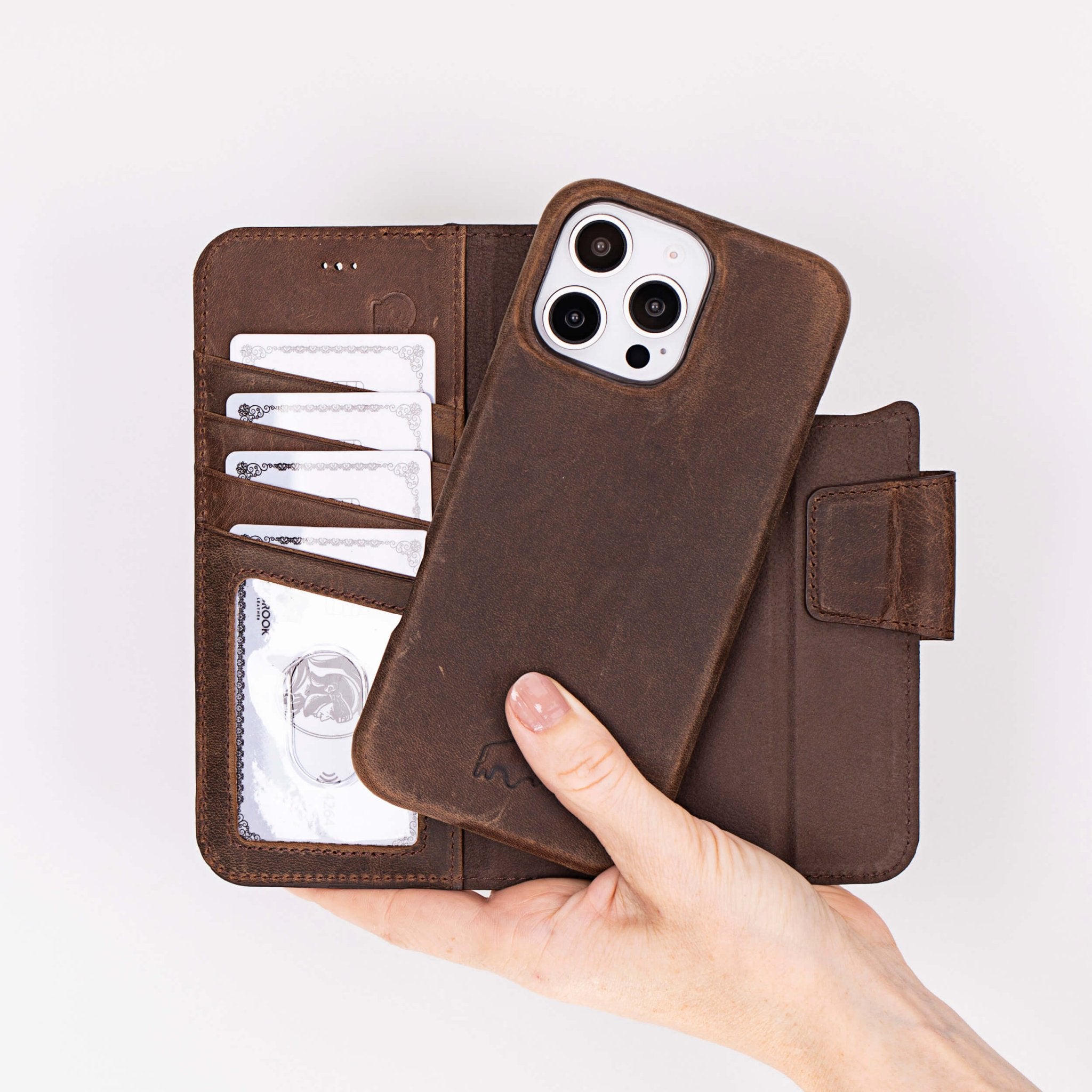 A handcrafted 2-in-1 wallet folio made for iPhone 16 Pro Max from full-grain leather. Secure snap-on phone case pairs with a magnetic card holder for everyday carry. Built for protection, designed for convenience.