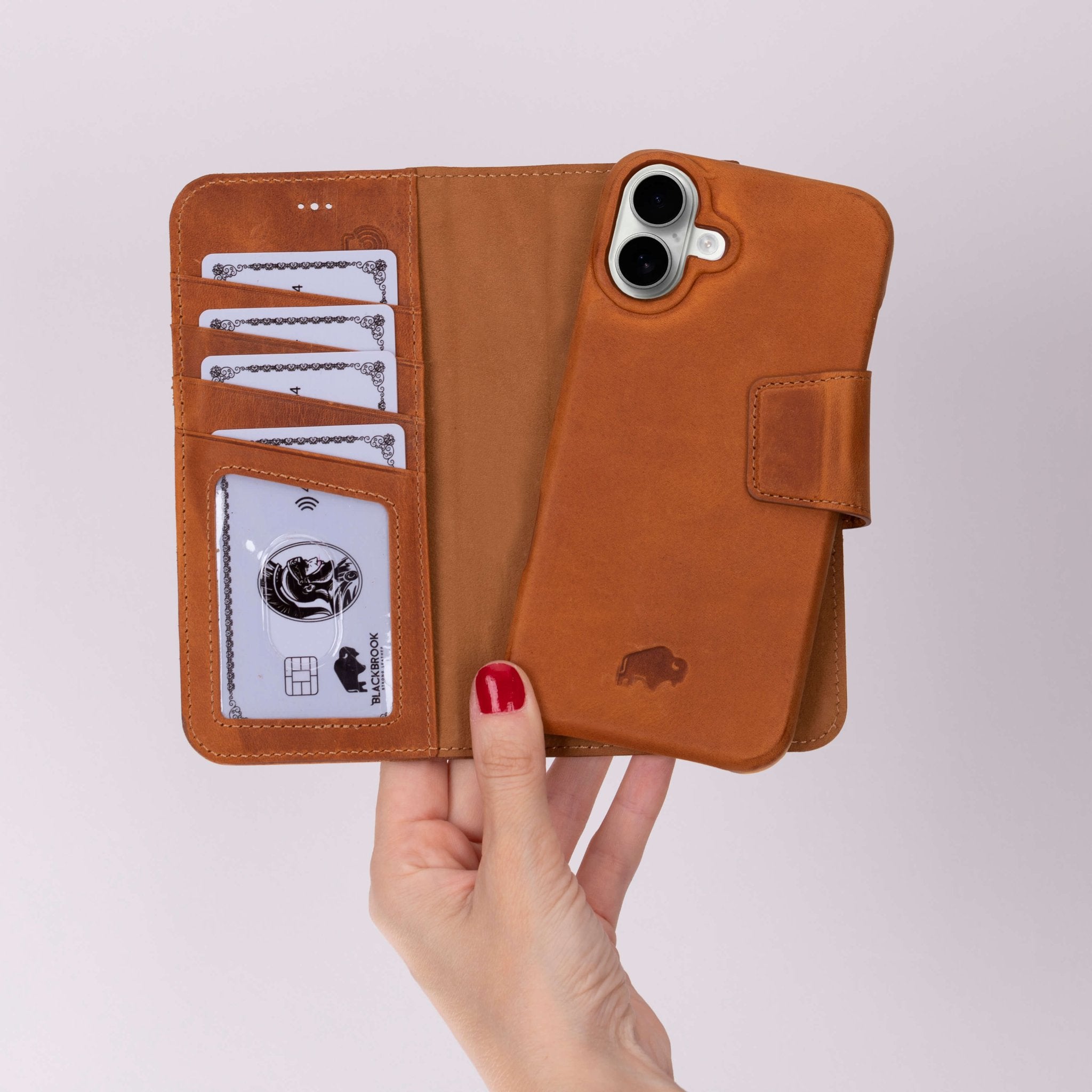 A handcrafted 2-in-1 wallet folio made for iPhone 16 Plus from full-grain leather. Secure snap-on phone case pairs with a magnetic card holder for everyday carry. Built for protection, designed for convenience.
