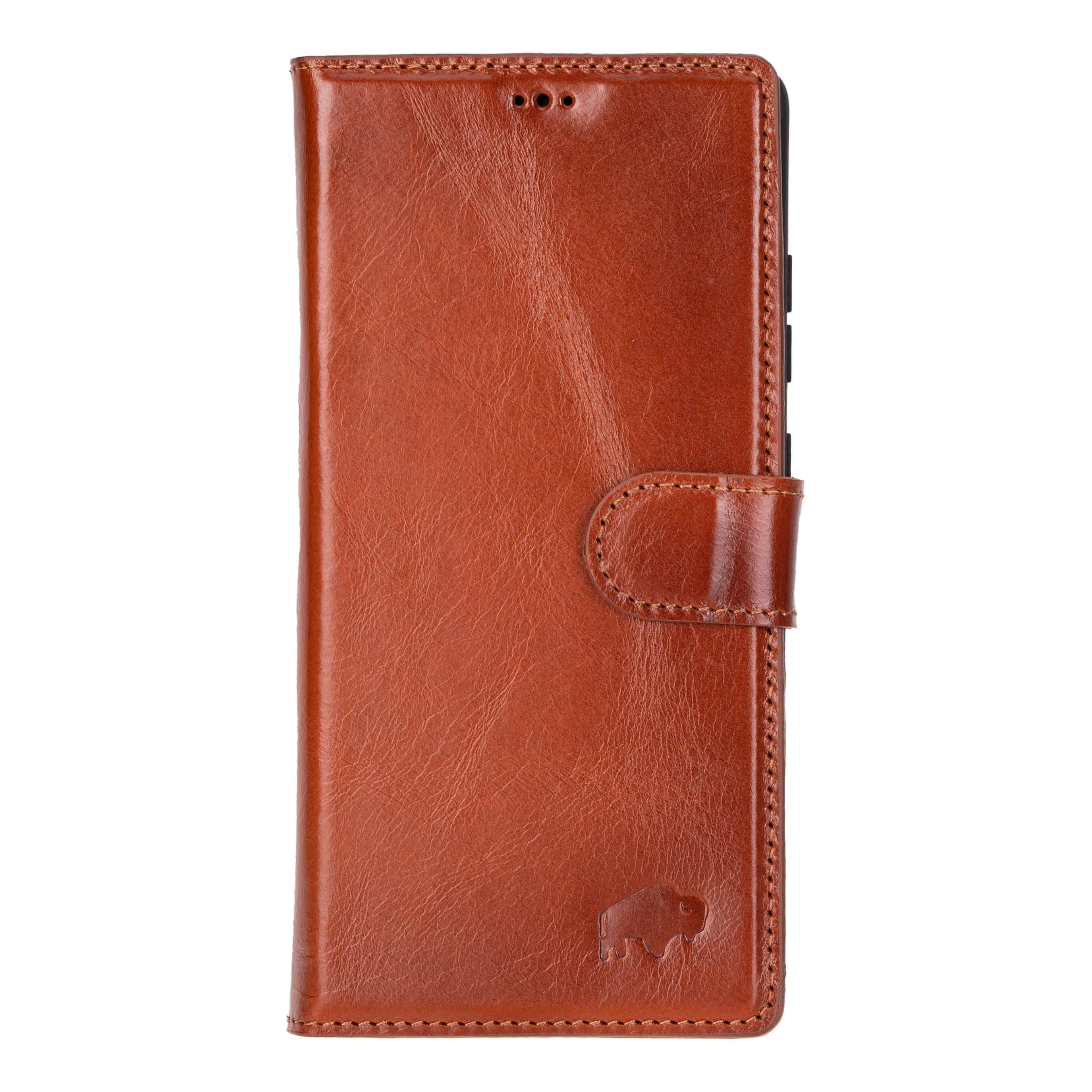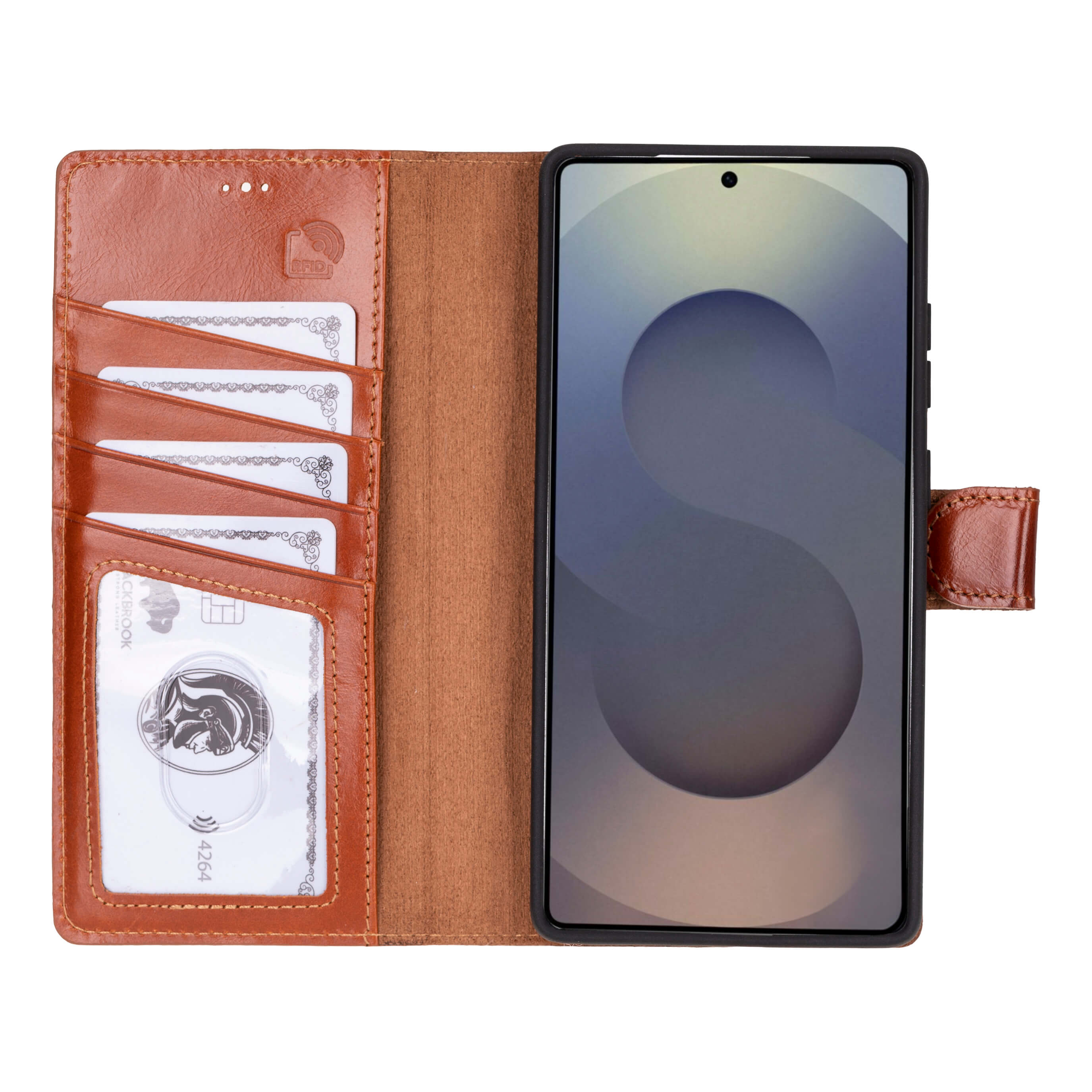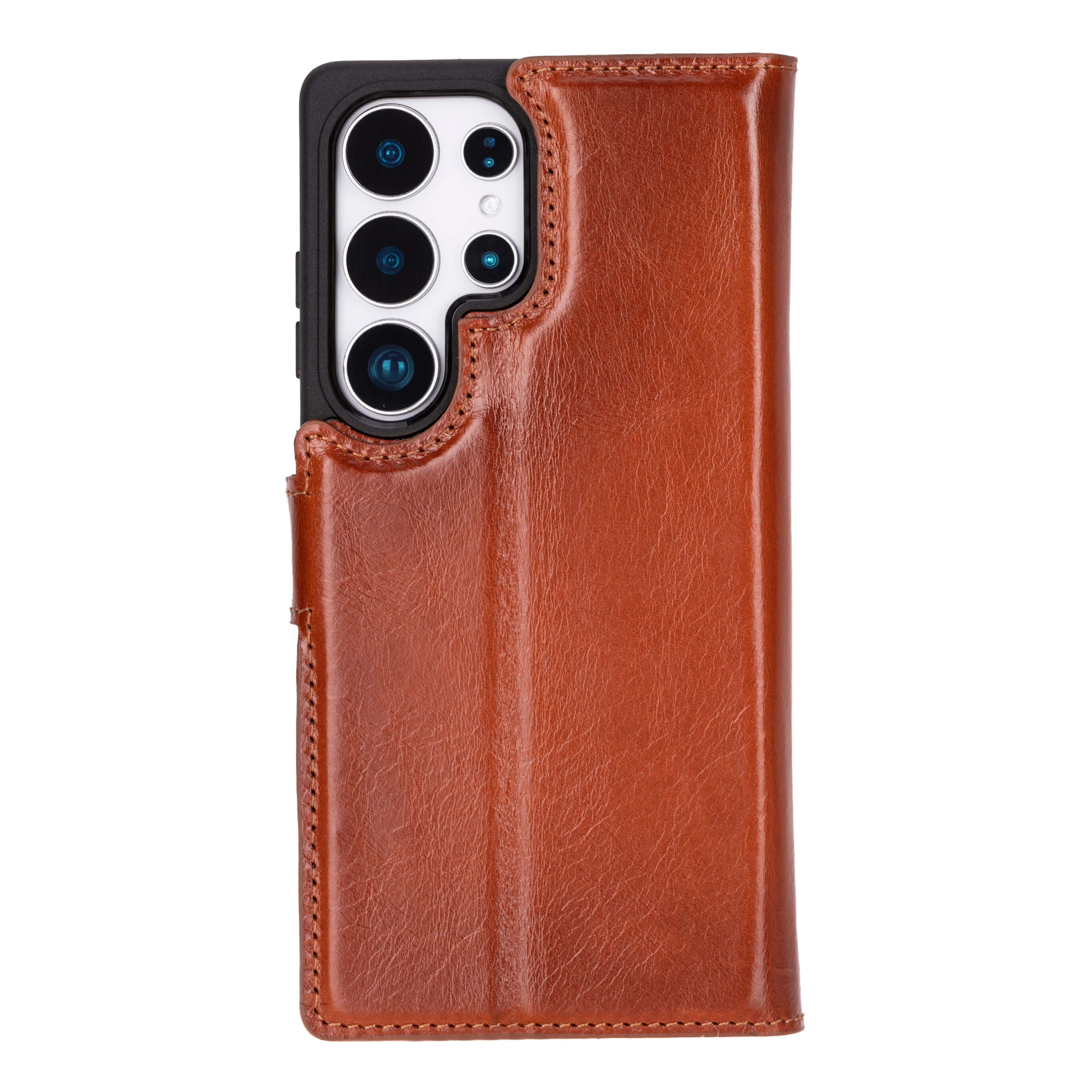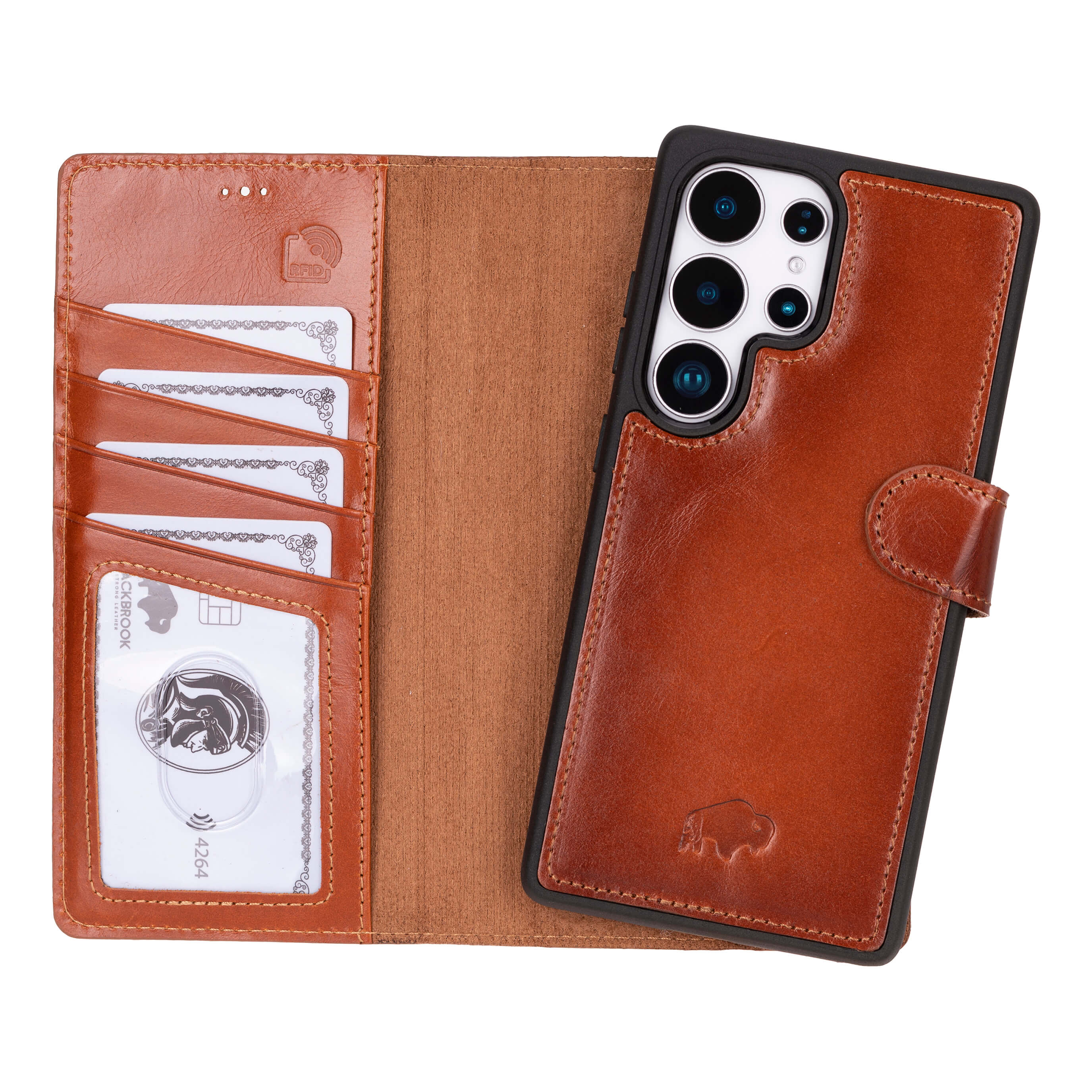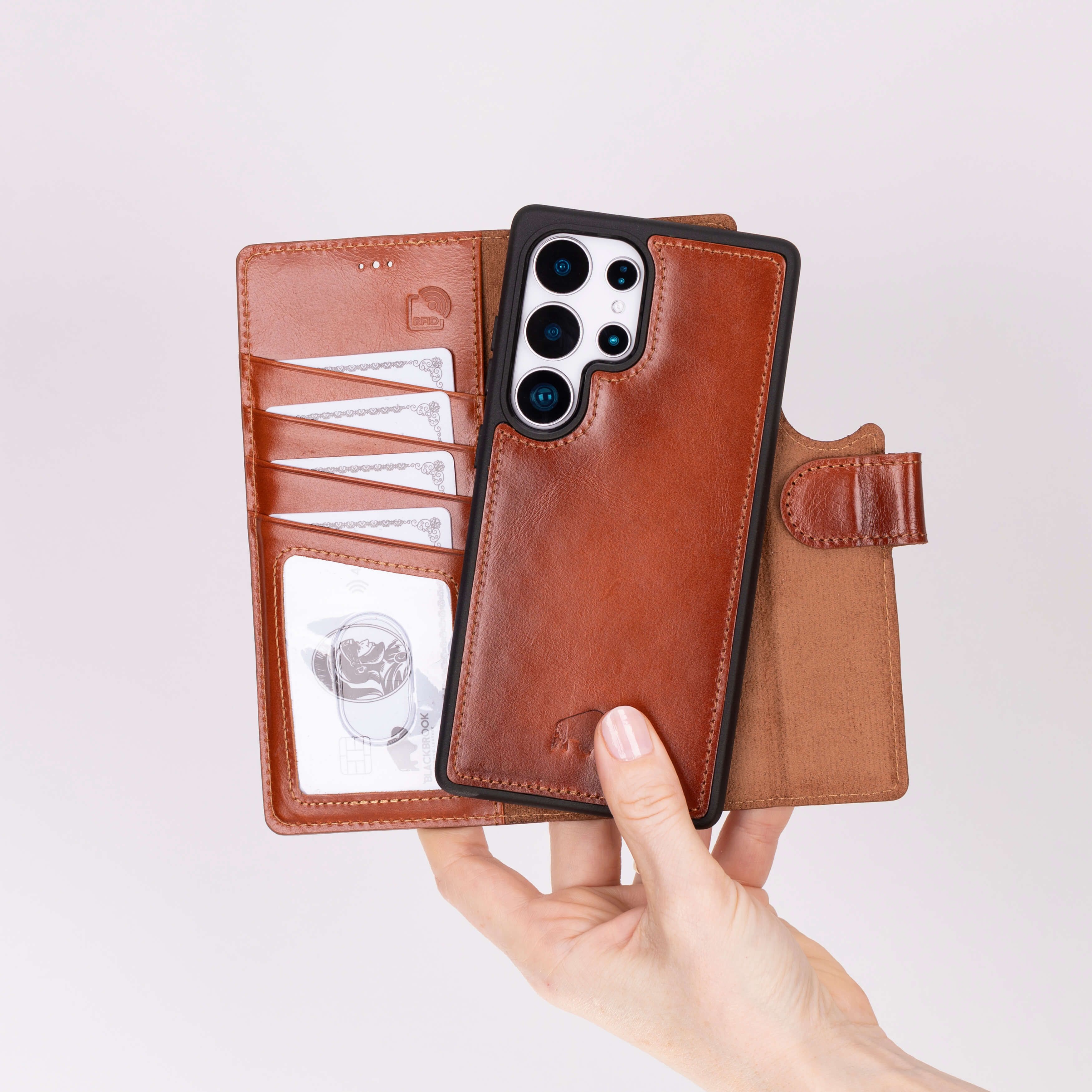 2-in-1 detachable leather wallet case built for Samsung Galaxy S25 Ultra. Full-grain leather, secure card storage, and a slim protective inner case.