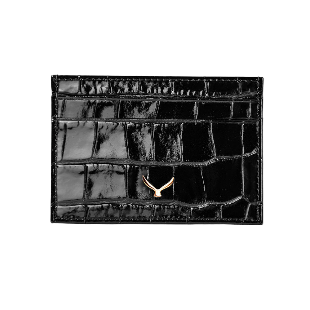Hand-made croco print leather card holder with four slots, bill compartment, and slim silhouette.