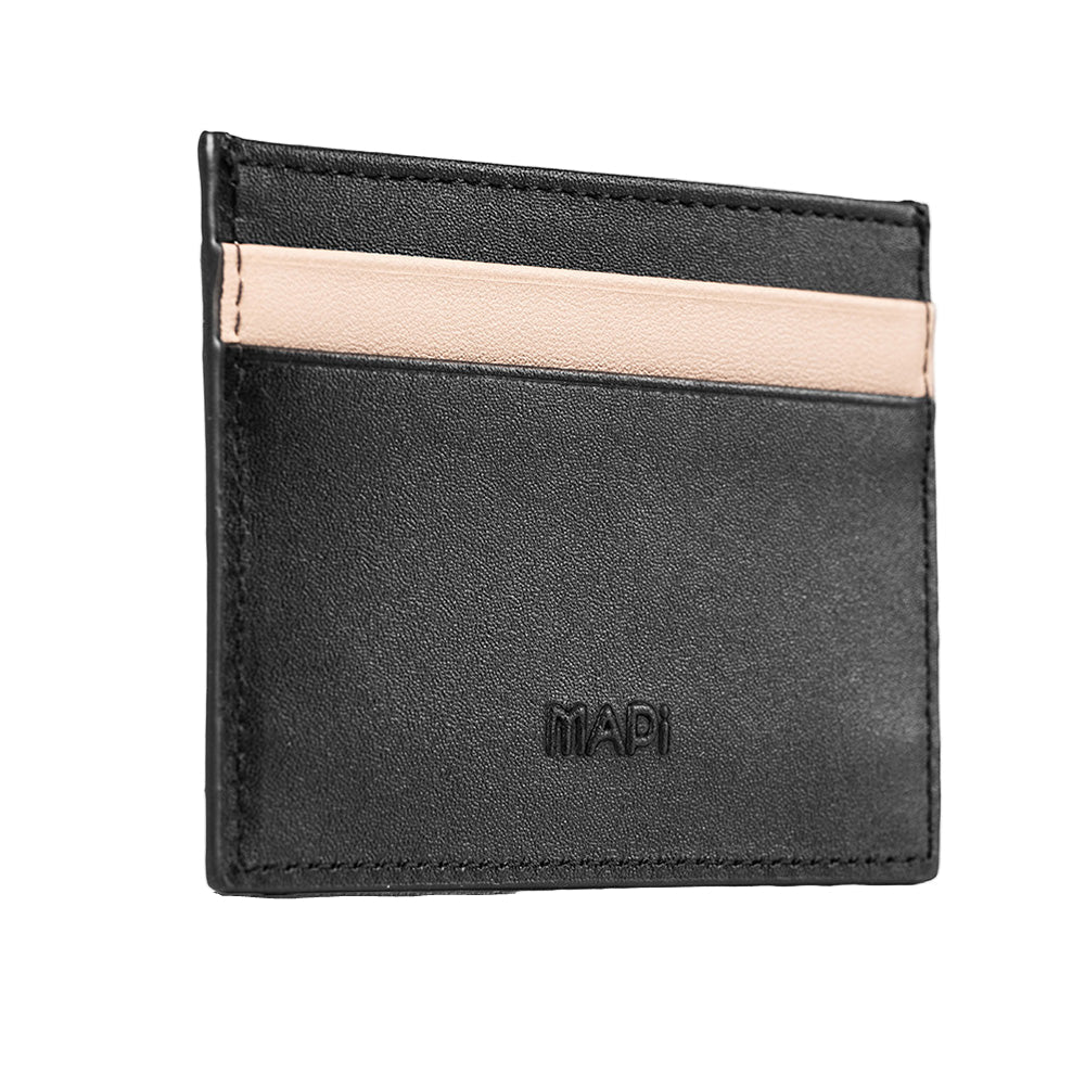 Hand-made dual-color leather card holder with four slots, bill compartment, and slim profile.