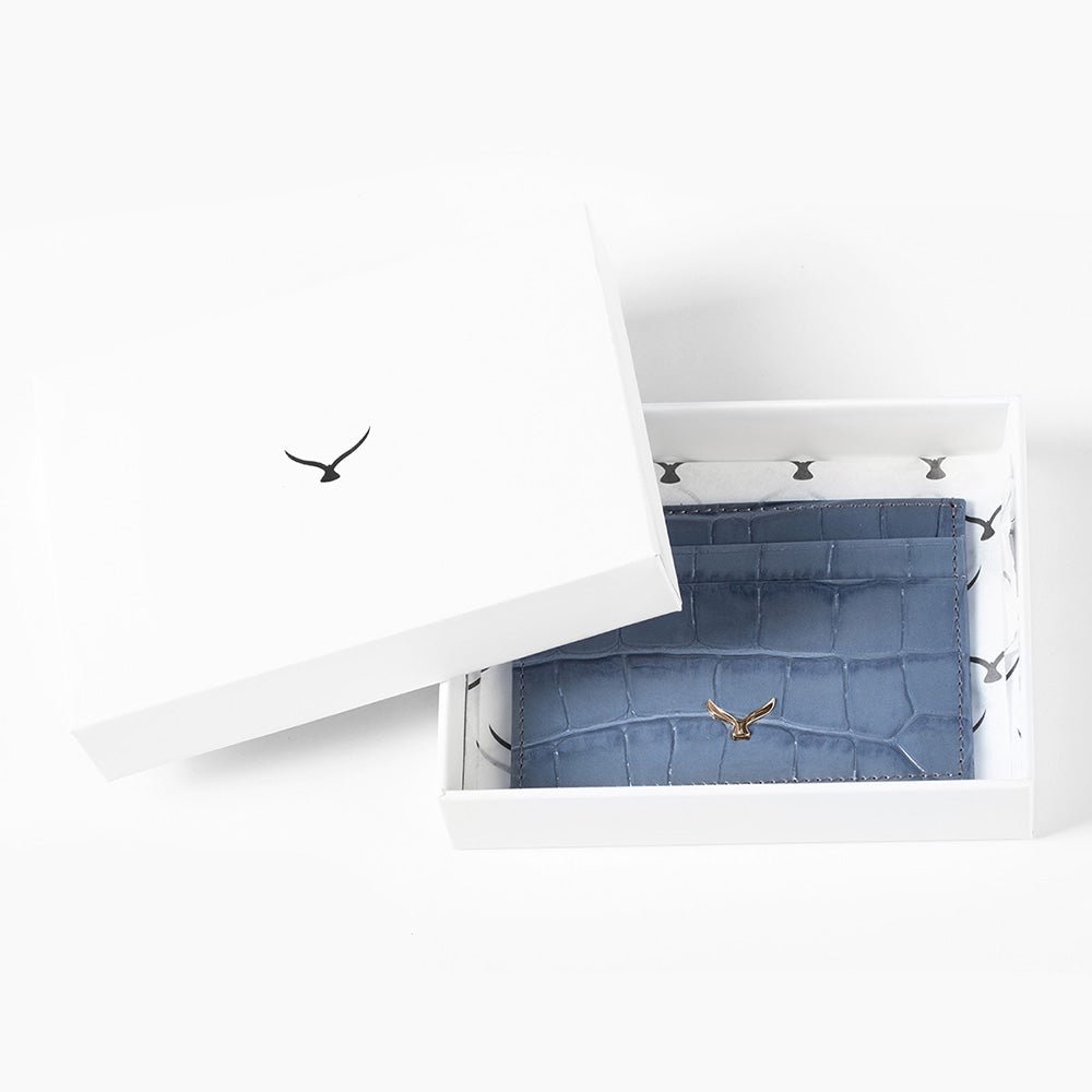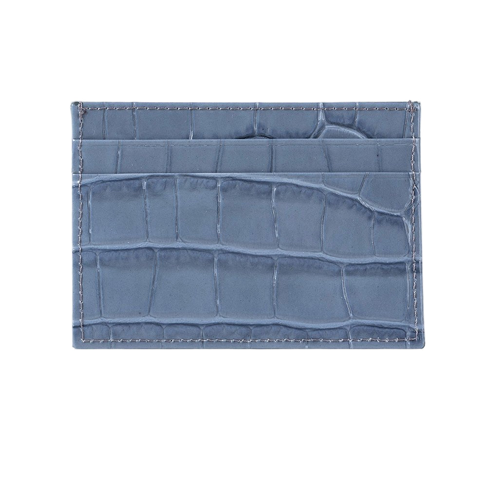 Hand-made croco print leather card holder with four slots, bill compartment, and slim silhouette.