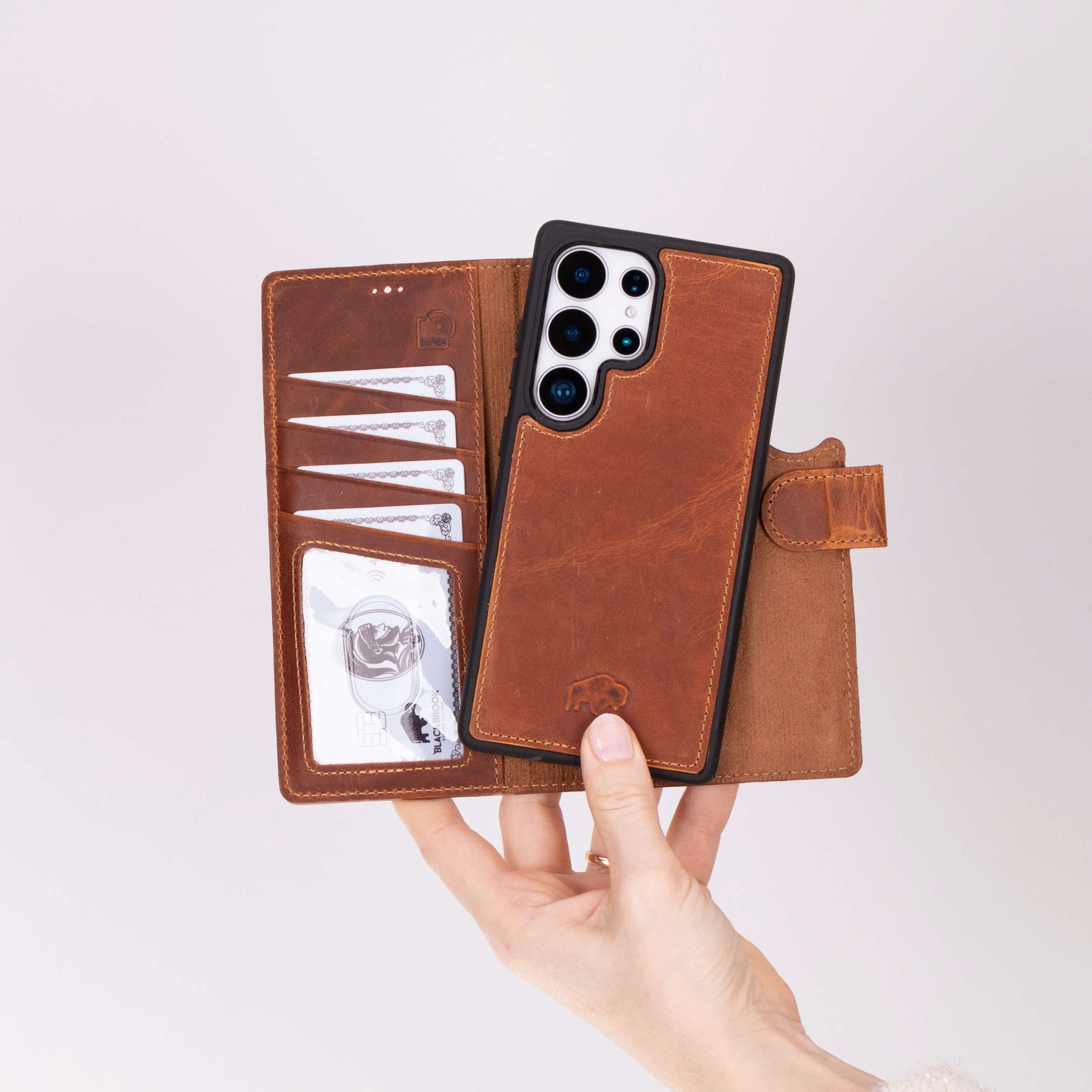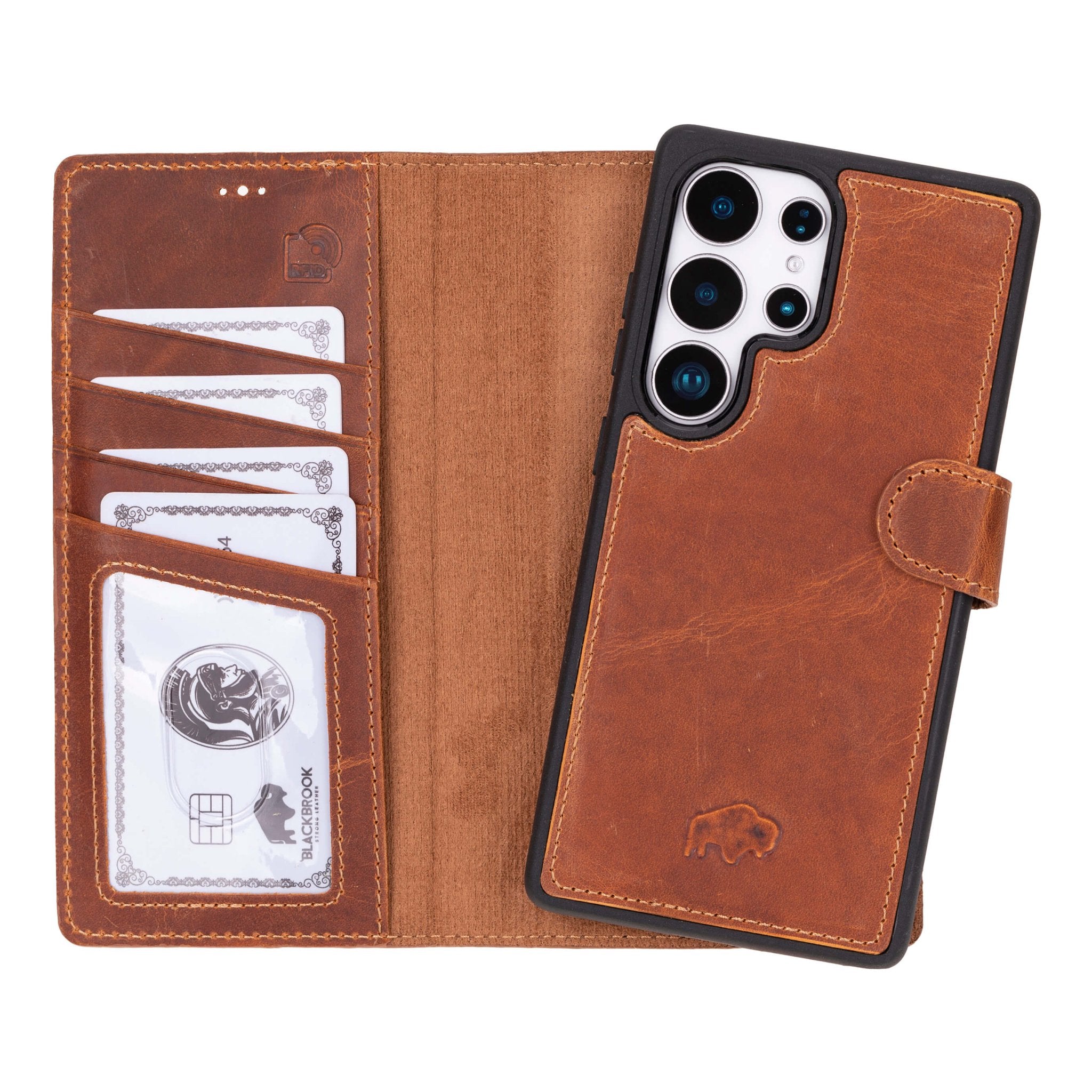 2-in-1 detachable leather wallet case built for Samsung Galaxy S25 Ultra. Full-grain leather, secure card storage, and a slim protective inner case.
