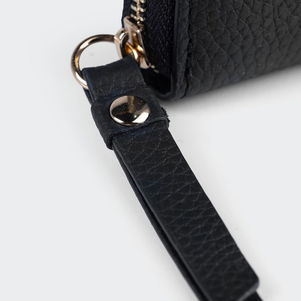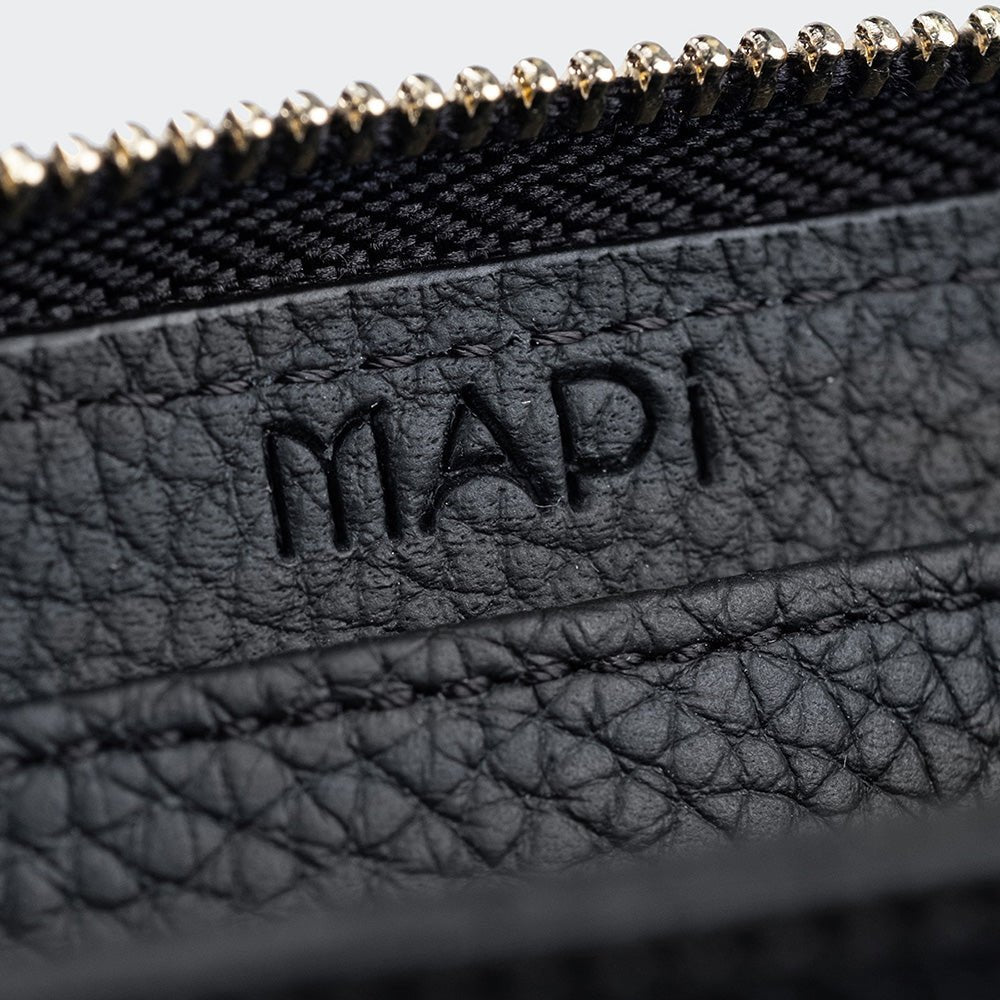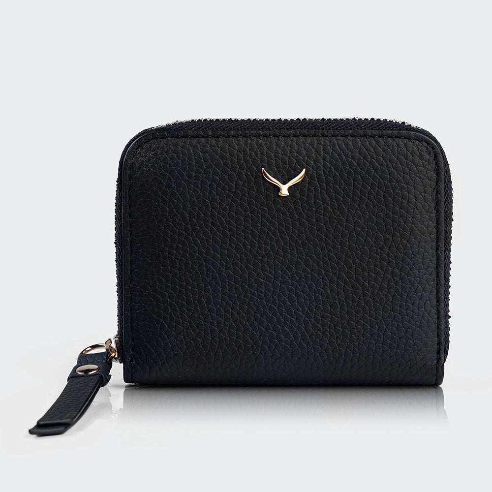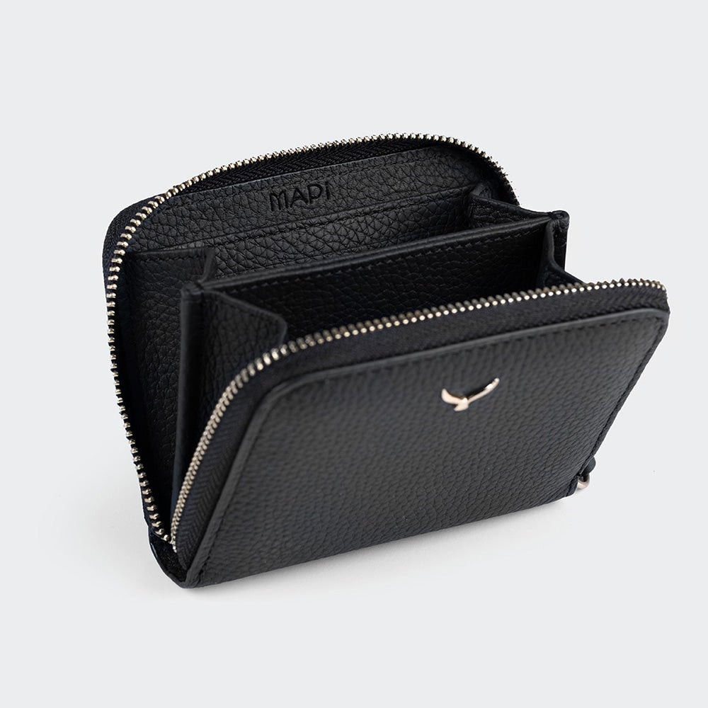 Compact hand-made leather wallet with four card slots, three pockets, and secure zip closure.