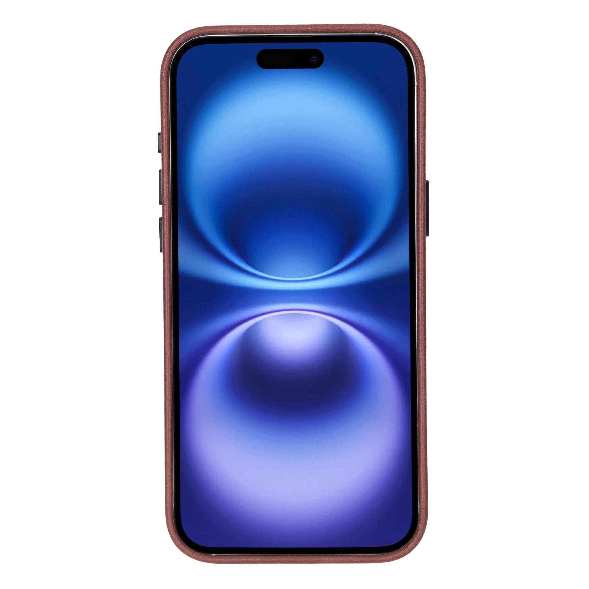 Full-grain leather MagSafe case for iPhone 17 with reinforced protection and a soft microfiber interior and camera capture button. Designed for everyday use with secure grip and precise access.