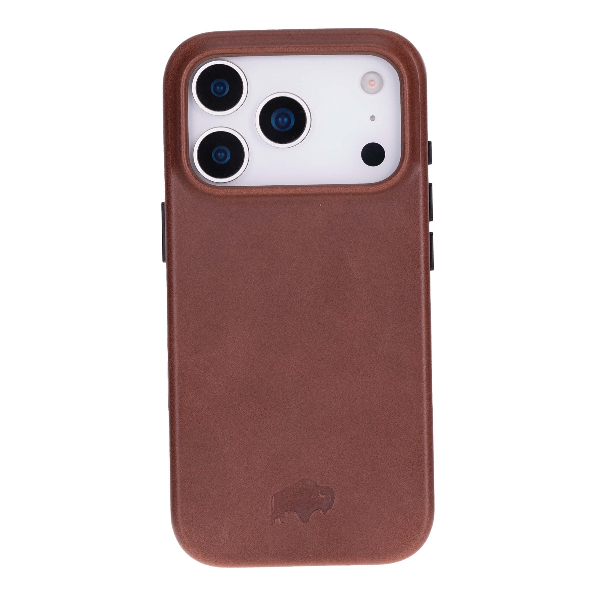 Full-grain leather MagSafe case for iPhone 17 Pro Max with reinforced protection and a soft microfiber interior and camera capture button. Designed for everyday use with secure grip and precise access.