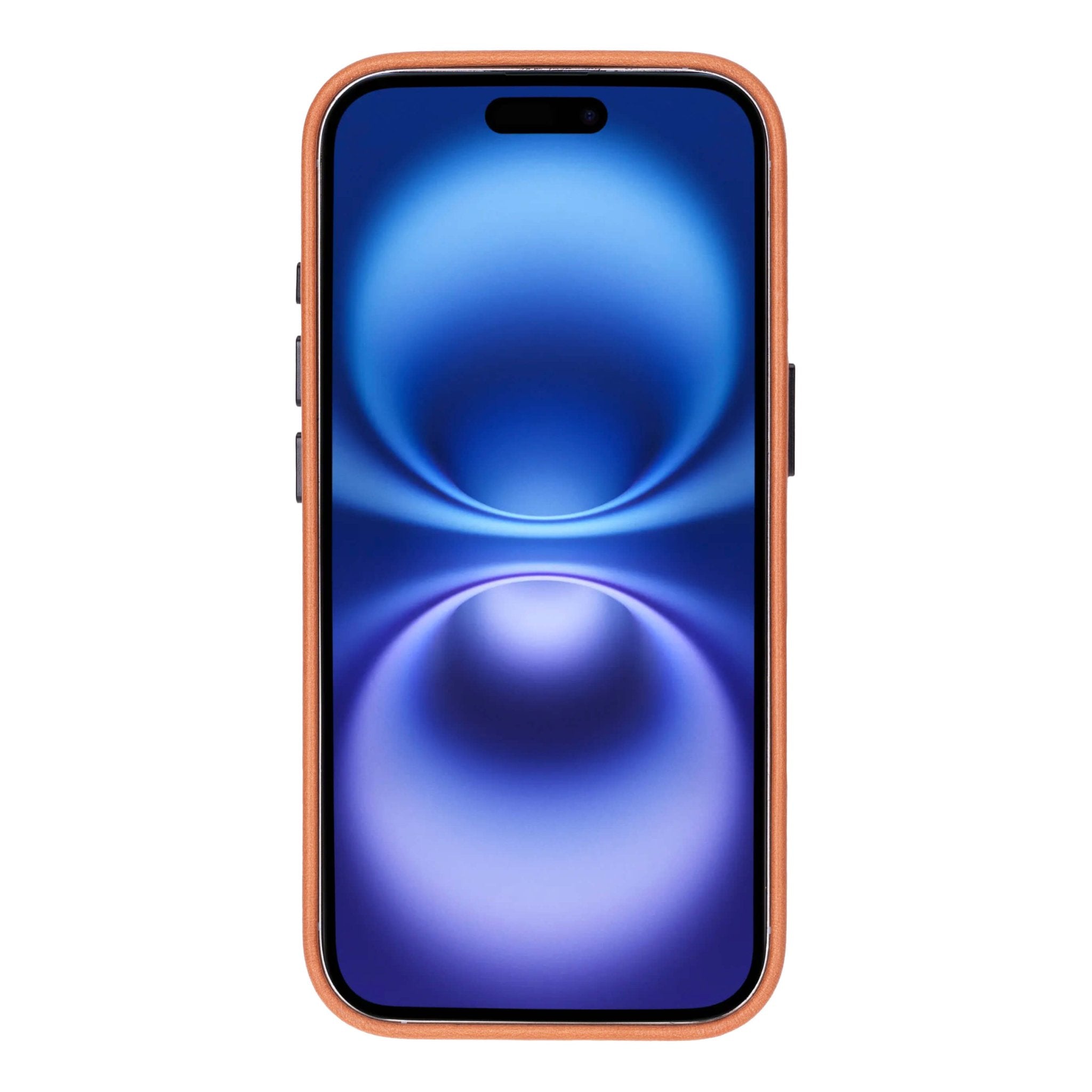 Slim snap-on leather case for iPhone 17 with reinforced edges and a metal camera ring. Designed for everyday protection with full side coverage.