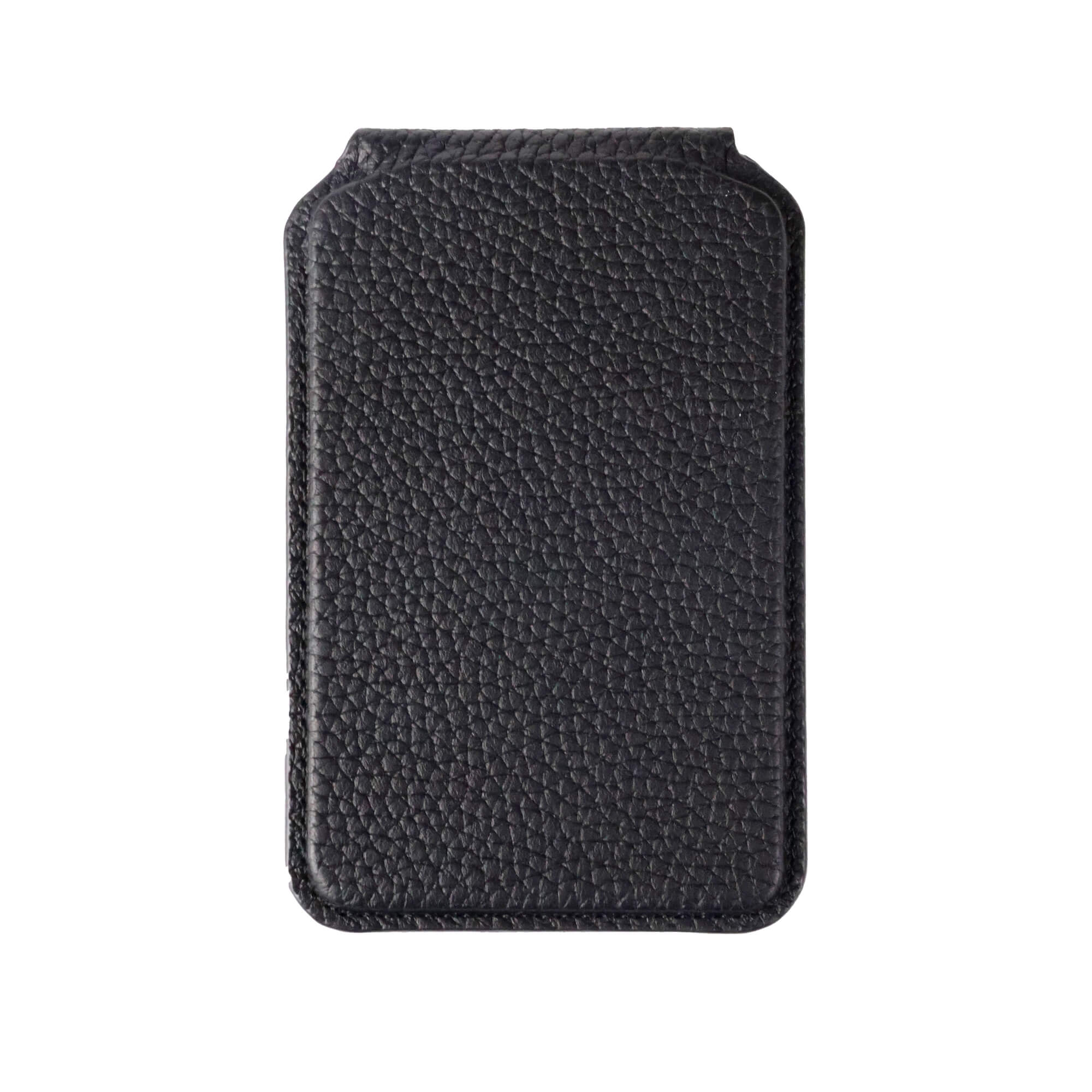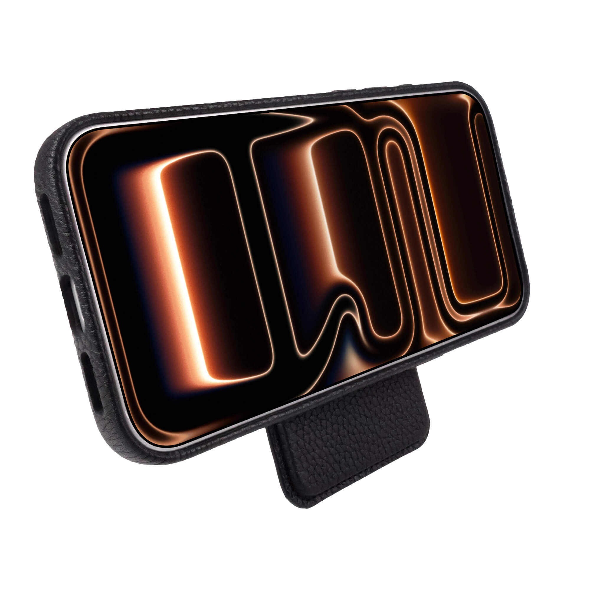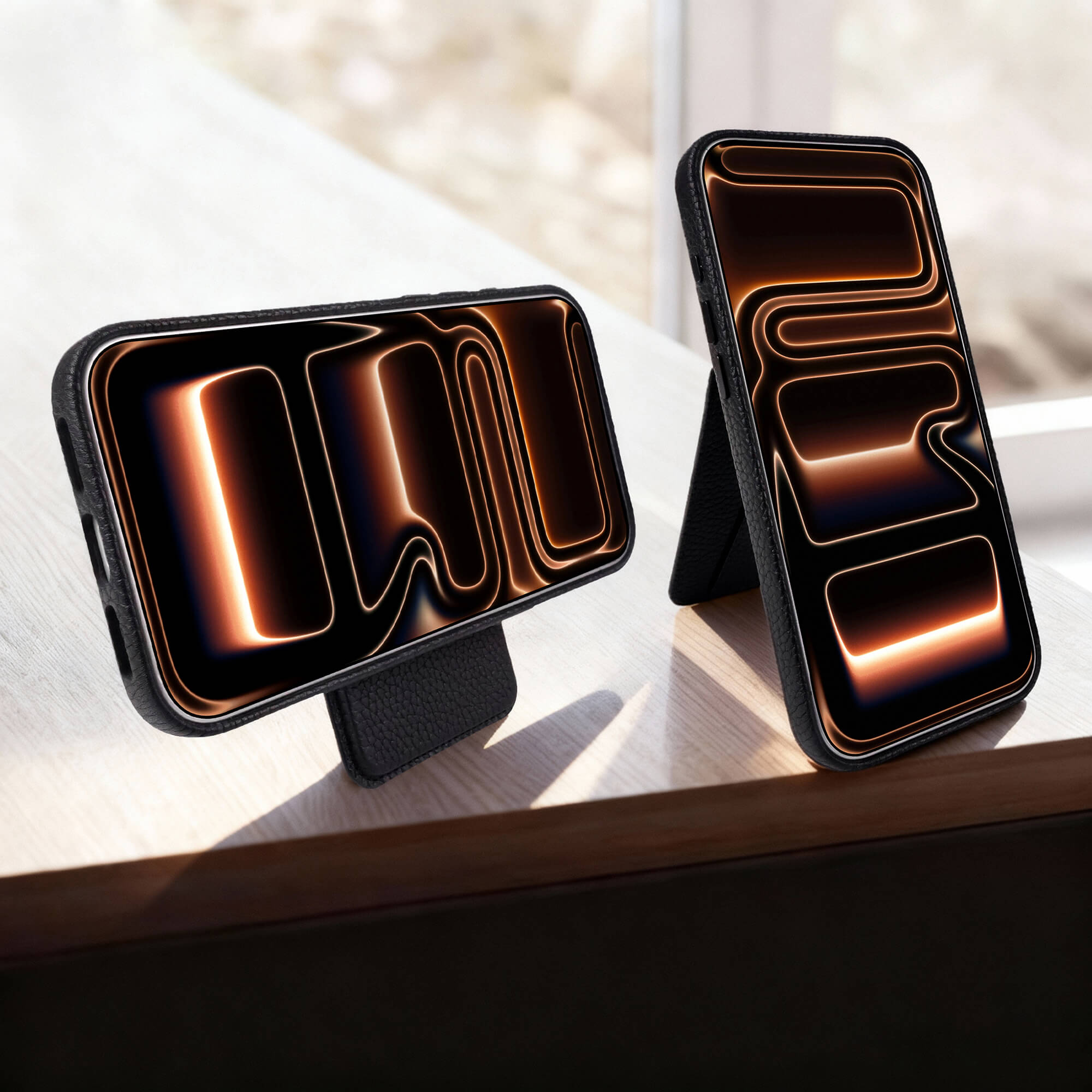 Full-grain leather MagSafe wallet with a built-in stand. Attaches securely to MagSafe iPhones and keeps cards accessible for everyday carry and hands-free use.