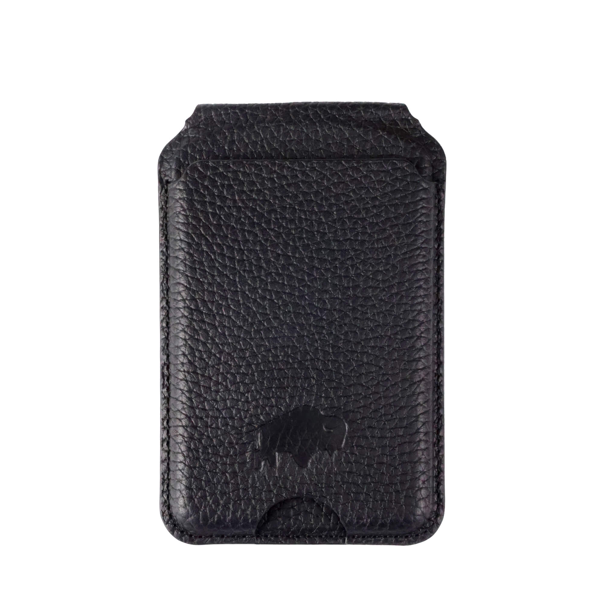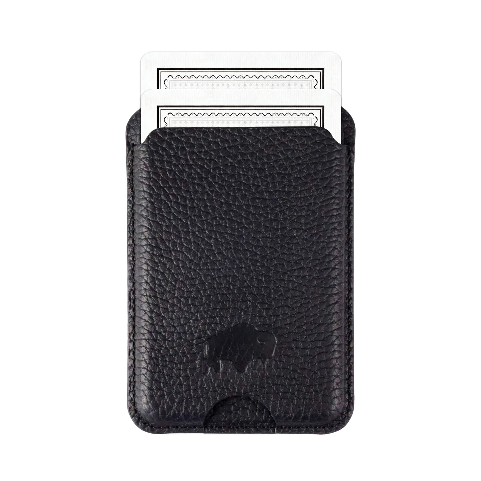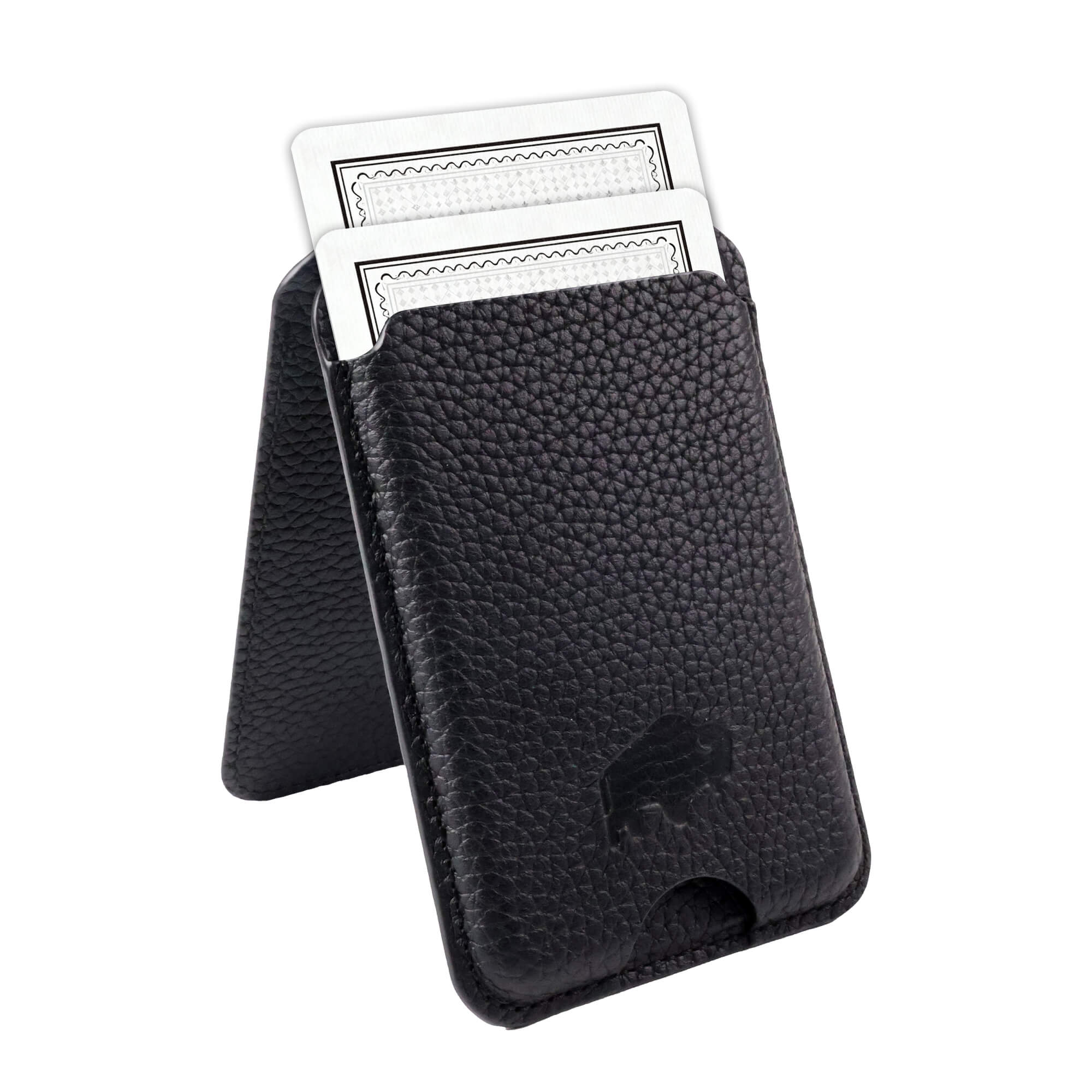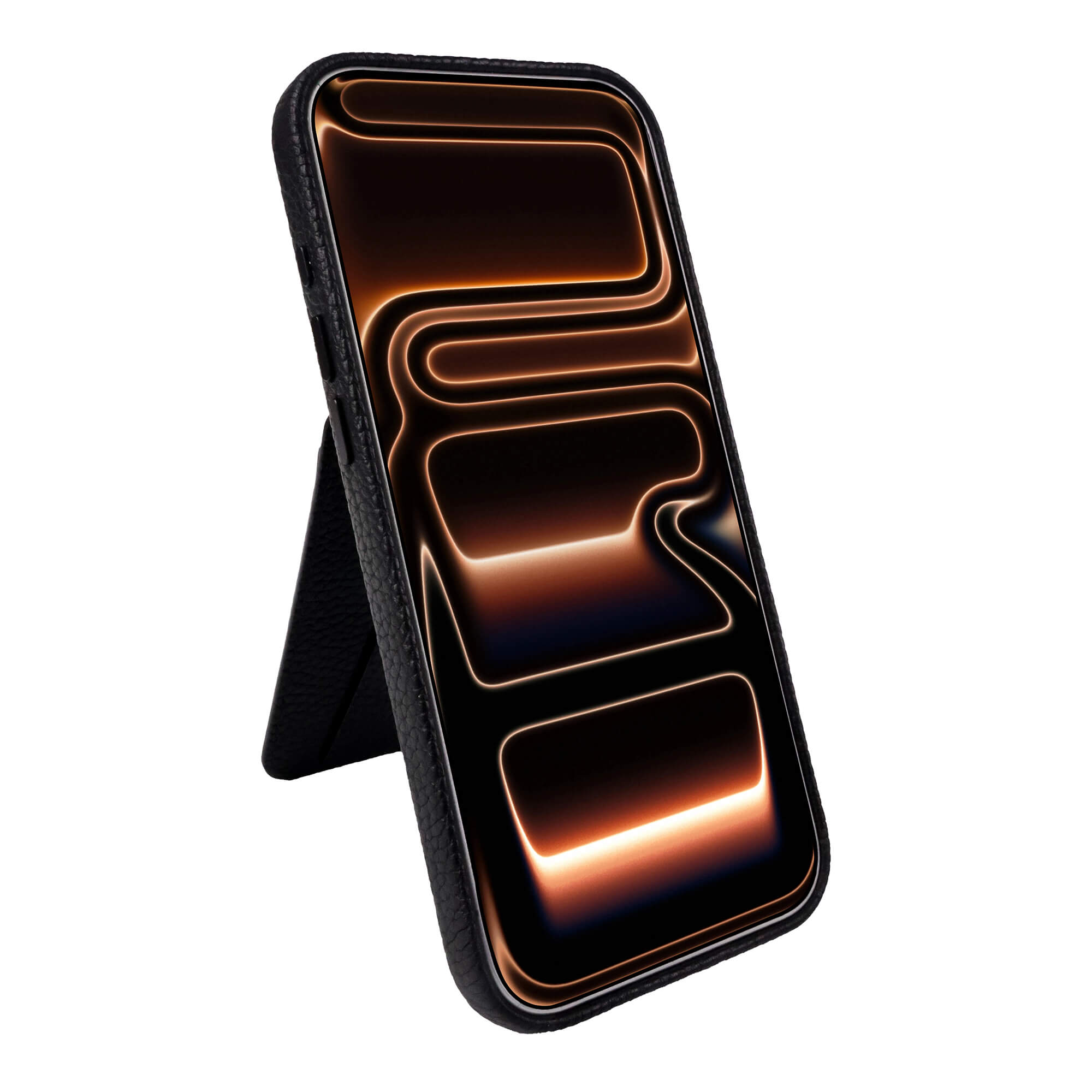 Full-grain leather MagSafe wallet with a built-in stand. Attaches securely to MagSafe iPhones and keeps cards accessible for everyday carry and hands-free use.