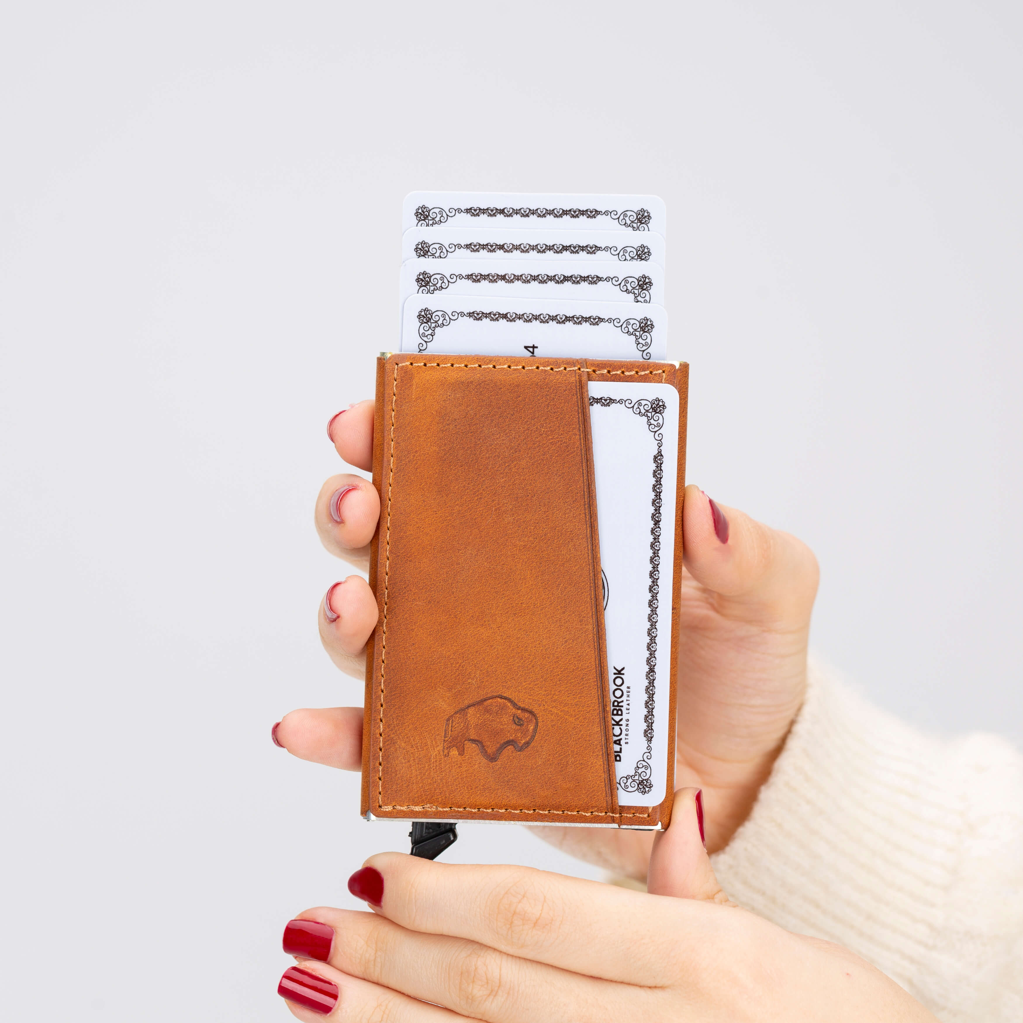 Sophisticated Mechanism: Equipped with a simple yet effective mechanical system, the cardholder allows for easy access to up to 5 credit cards with 2 additional card slots for IDs & easy access on the outside. Its intuitive design ensures a smooth and effortless card retrieval experience.