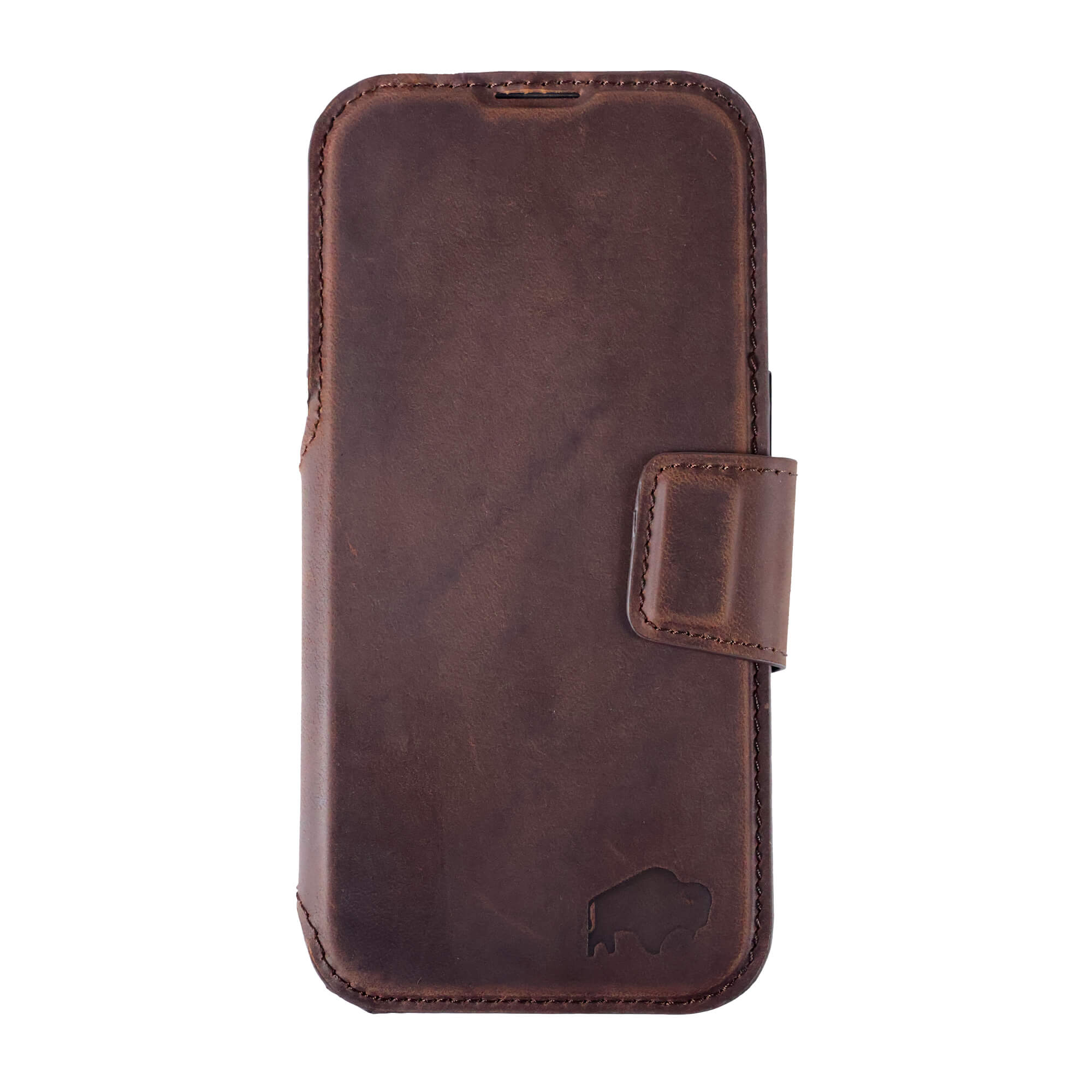 This is the wallet portion only — a one-piece, full-grain leather magnetic wallet built to pair with our snap-on case system or with just the iPhone itself without any case on it. Slim, secure, and intentionally simple. No plastic windows. No stand. Just a clean, slim leather wallet that stays firmly attached and carries what you actually need.