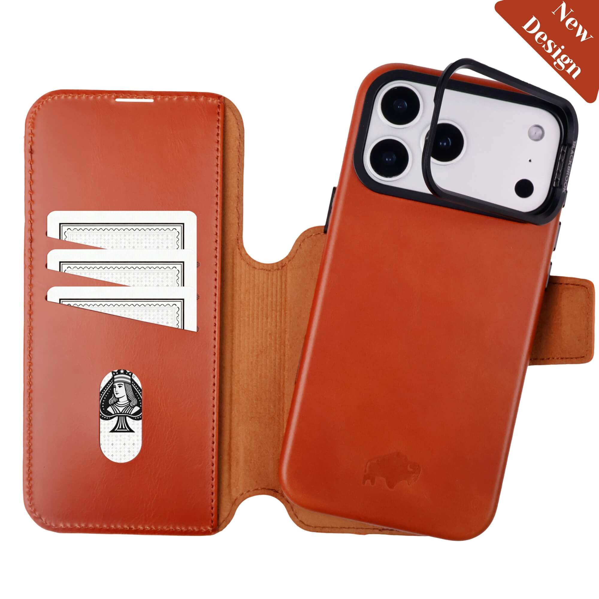 2-in-1 full-grain leather wallet case for iPhone 17 Pro Max with a detachable snap-on phone case. Designed for everyday carry with built-in card storage and screen protection.