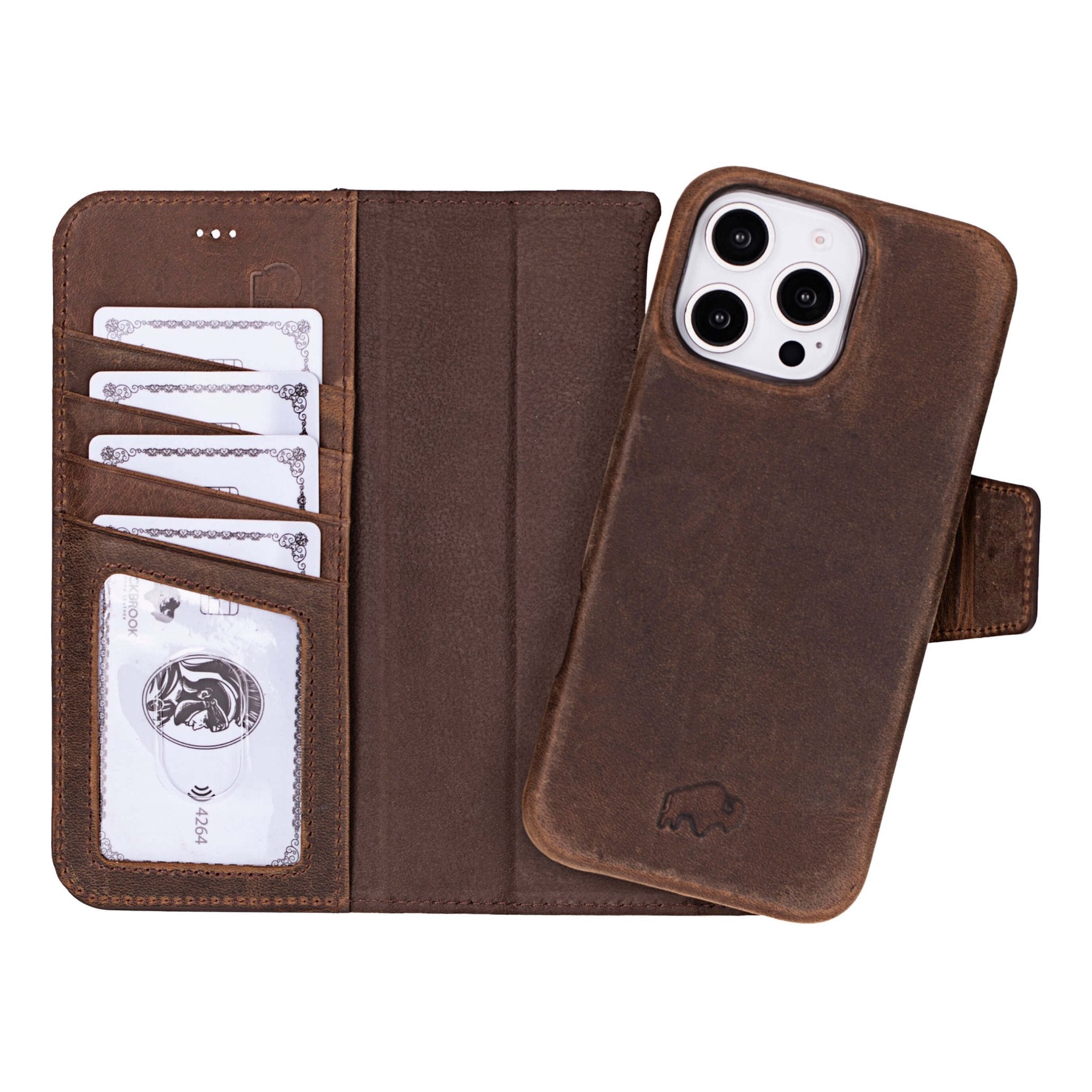 2-in-1 full-grain leather wallet case for iPhone 16 Pro Max with a detachable snap-on phone case. Designed for everyday carry with built-in card storage and screen protection.