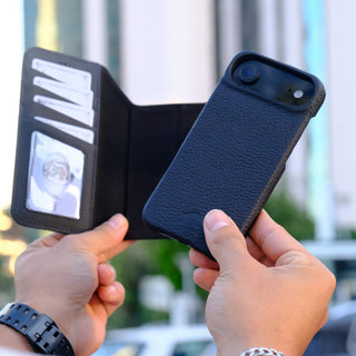 A handcrafted 2-in-1 wallet folio made from full-grain leather. Secure snap-on phone case pairs with a magnetic card holder for everyday carry. Built for protection, designed for convenience.