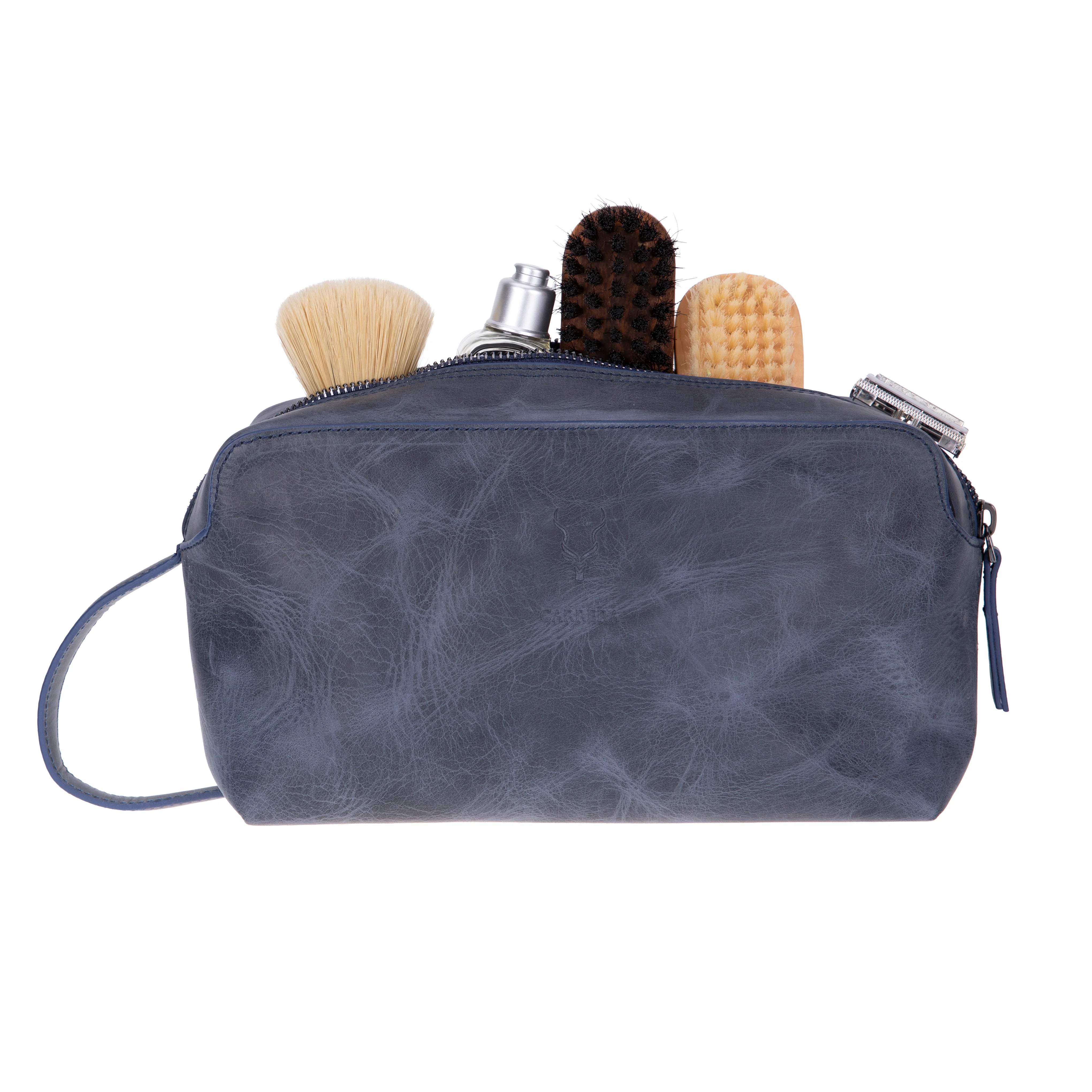 A top-grain cowhide handheld and toiletry bag that earns its character over time.