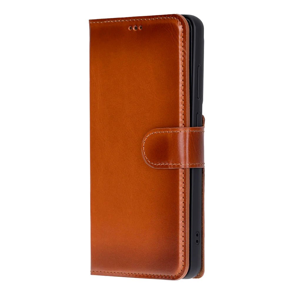 A magnetic detachment makes it easy to switch between a full leather wallet and a slim protective phone case.