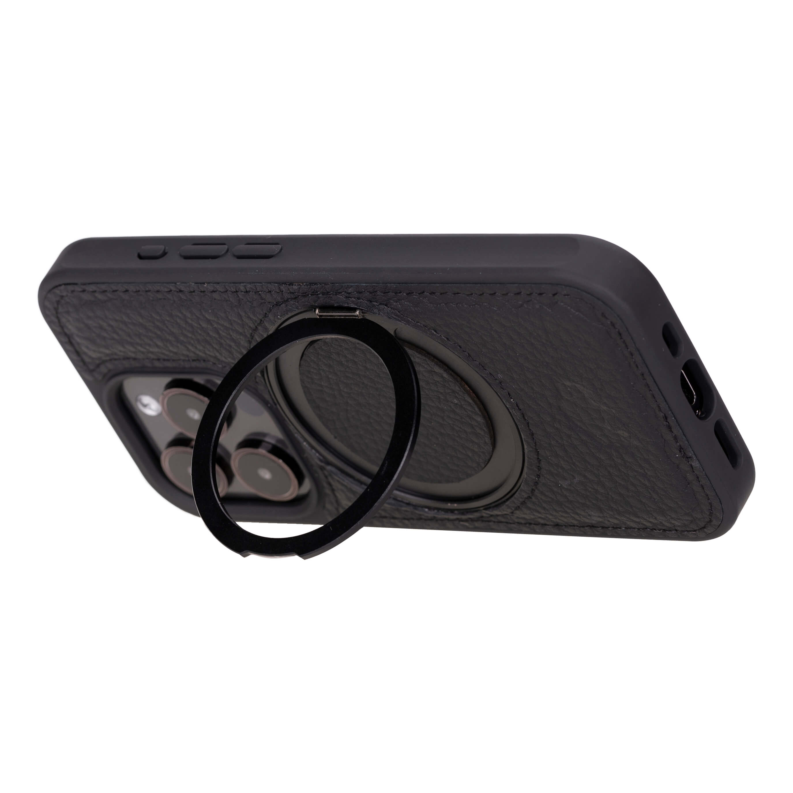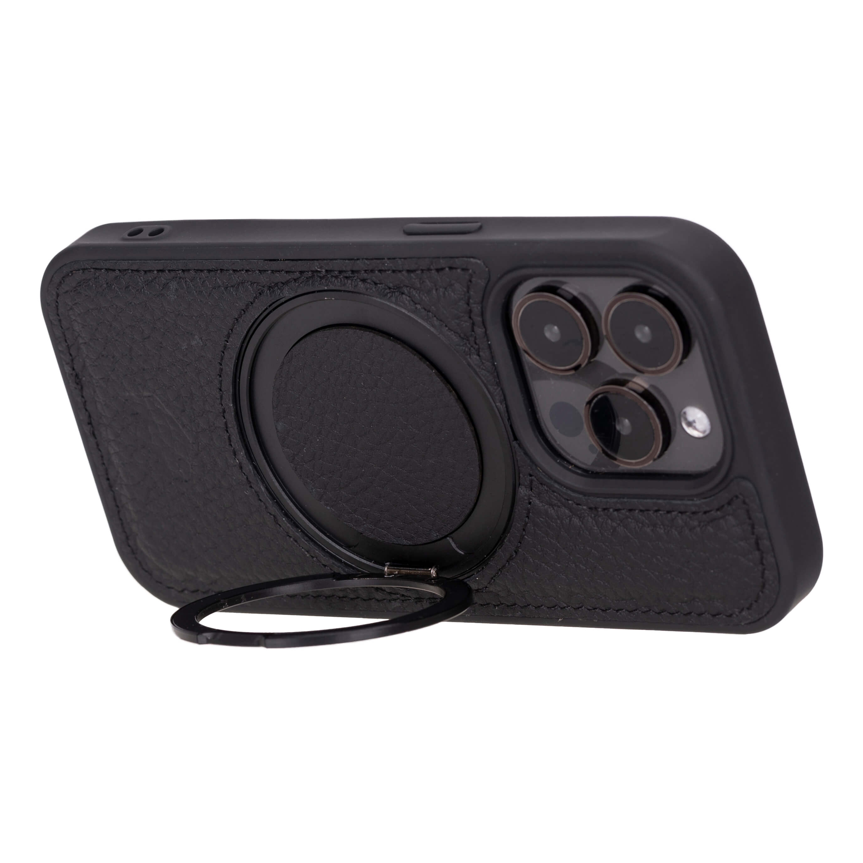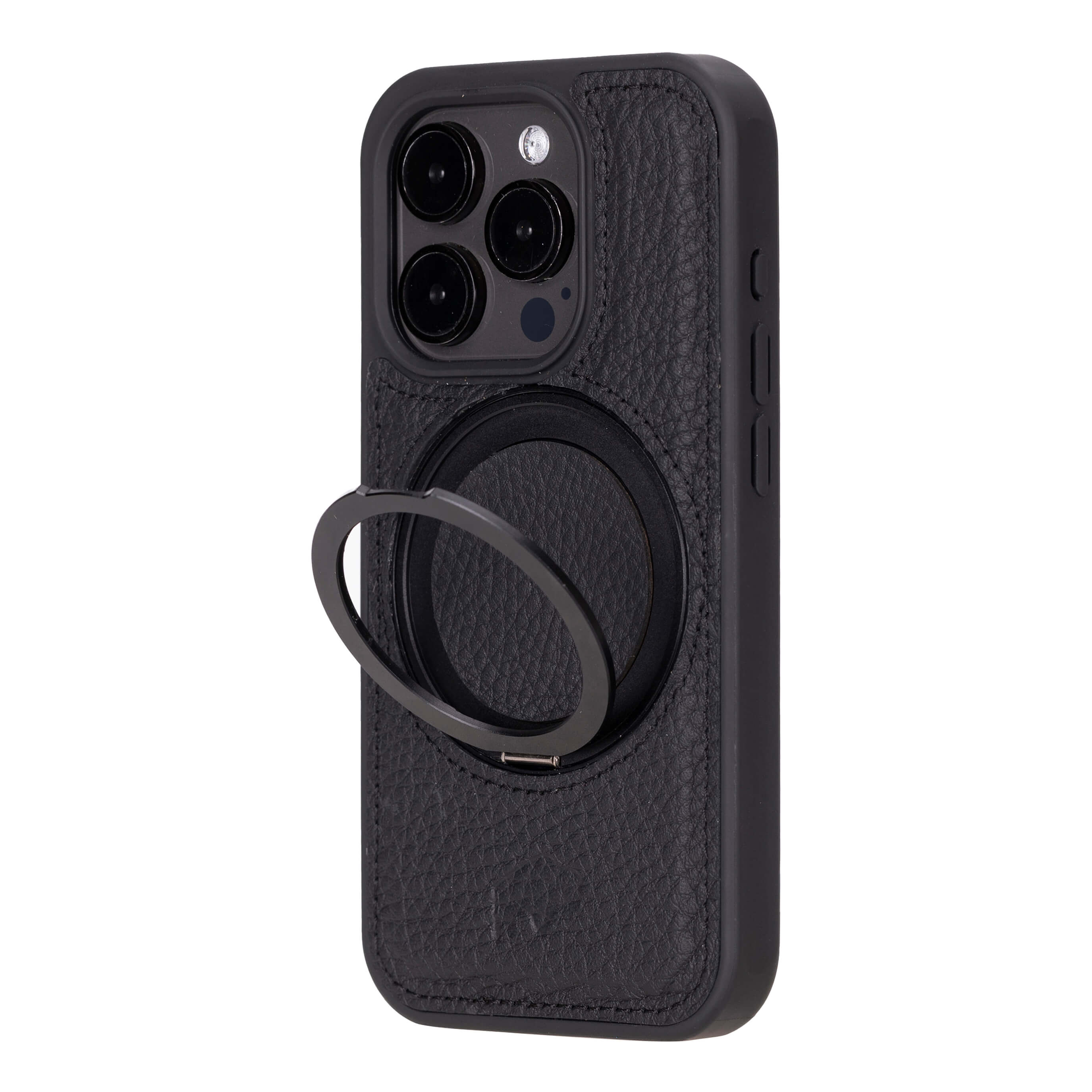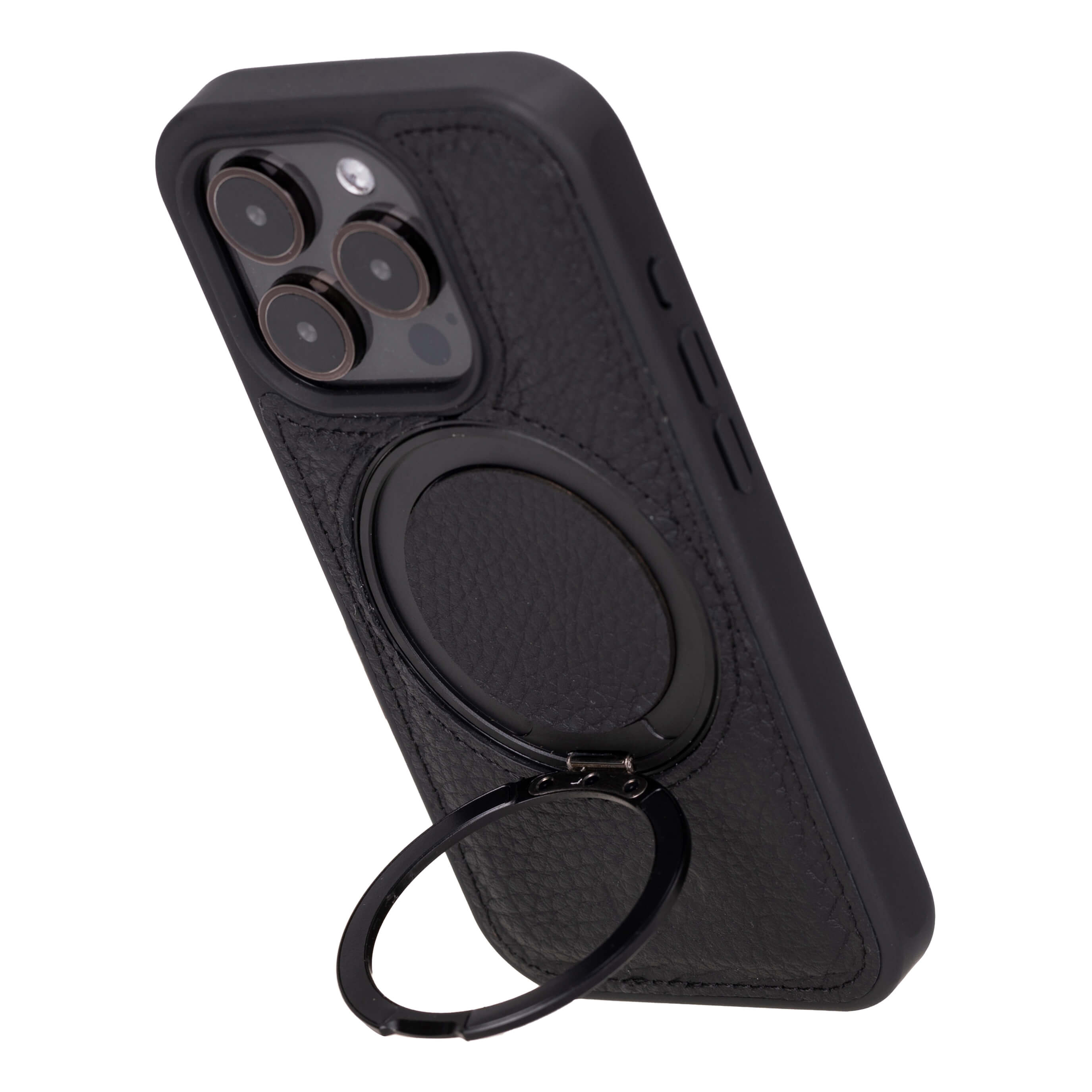 Luxurious full-grain leather case with innovative circular stand/grip, and superior protection in one sleek design for iPhone 15 Pro.