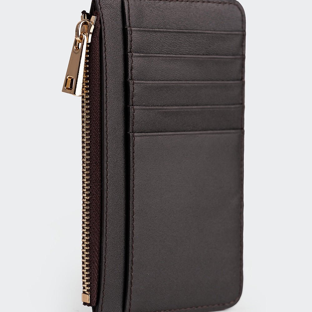 Hand-made leather card holder with five slots, front bill pocket, and secure zip coin pocket.