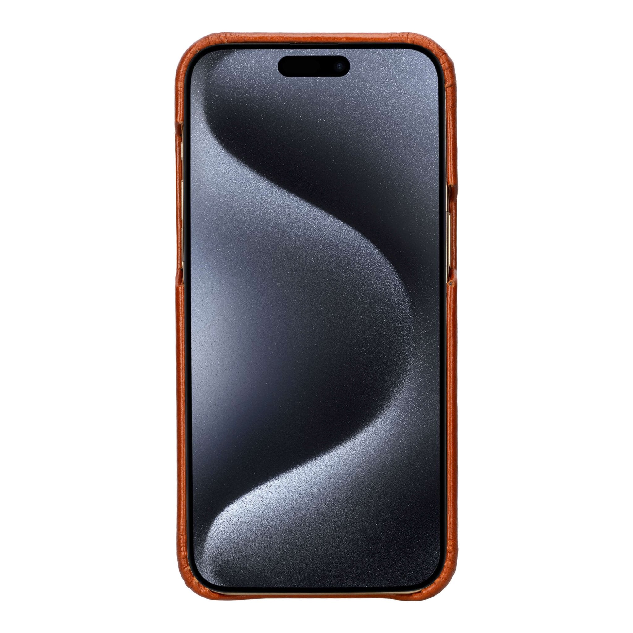 Slim snap-on full-grain leather case for iPhone 15 Pro. Compatible with MagSafe and Qi wireless charging. Raised edge for everyday screen protection.