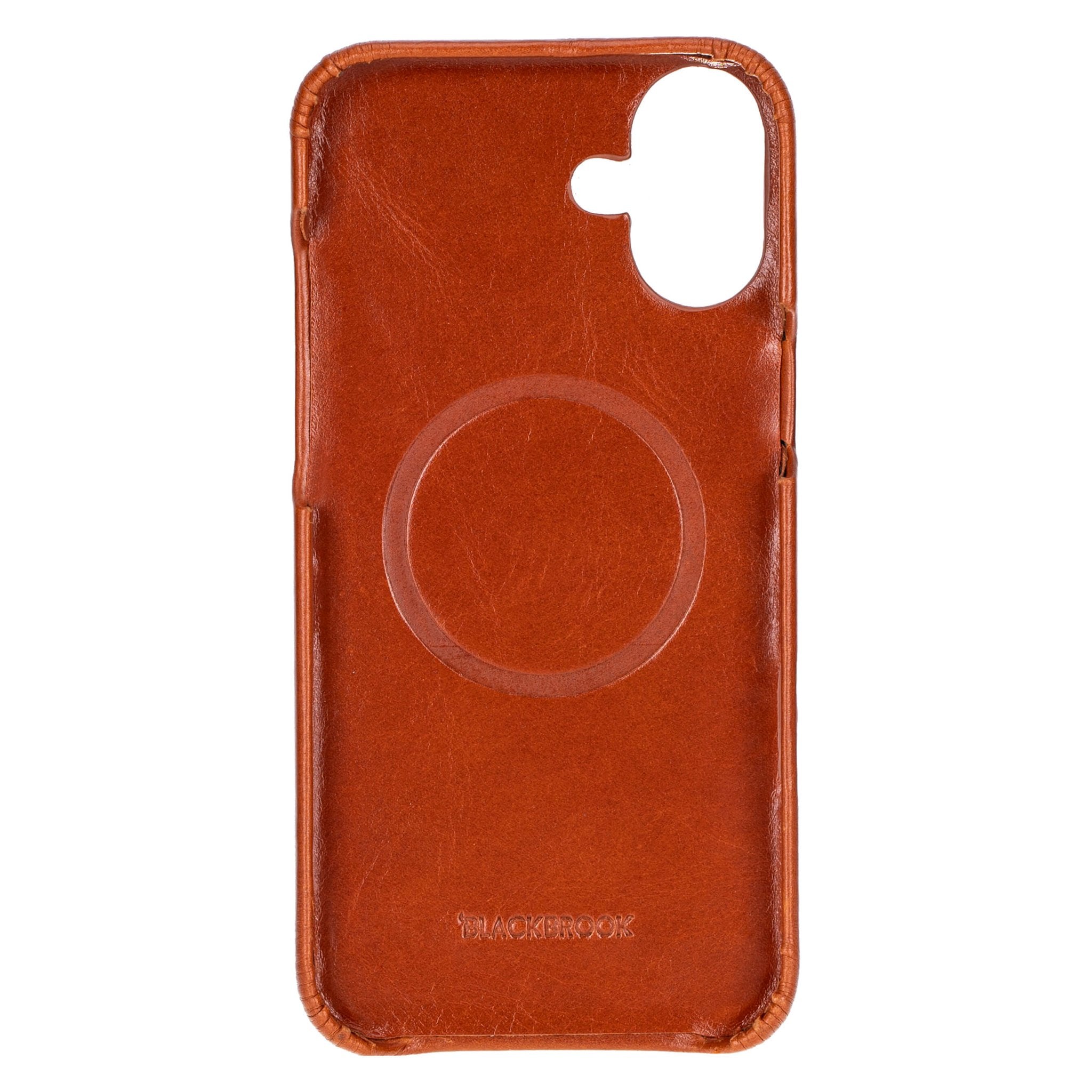 Slim snap-on full-grain leather case for iPhone 16 Plus. Compatible with MagSafe and Qi wireless charging. Raised edge for everyday screen protection.