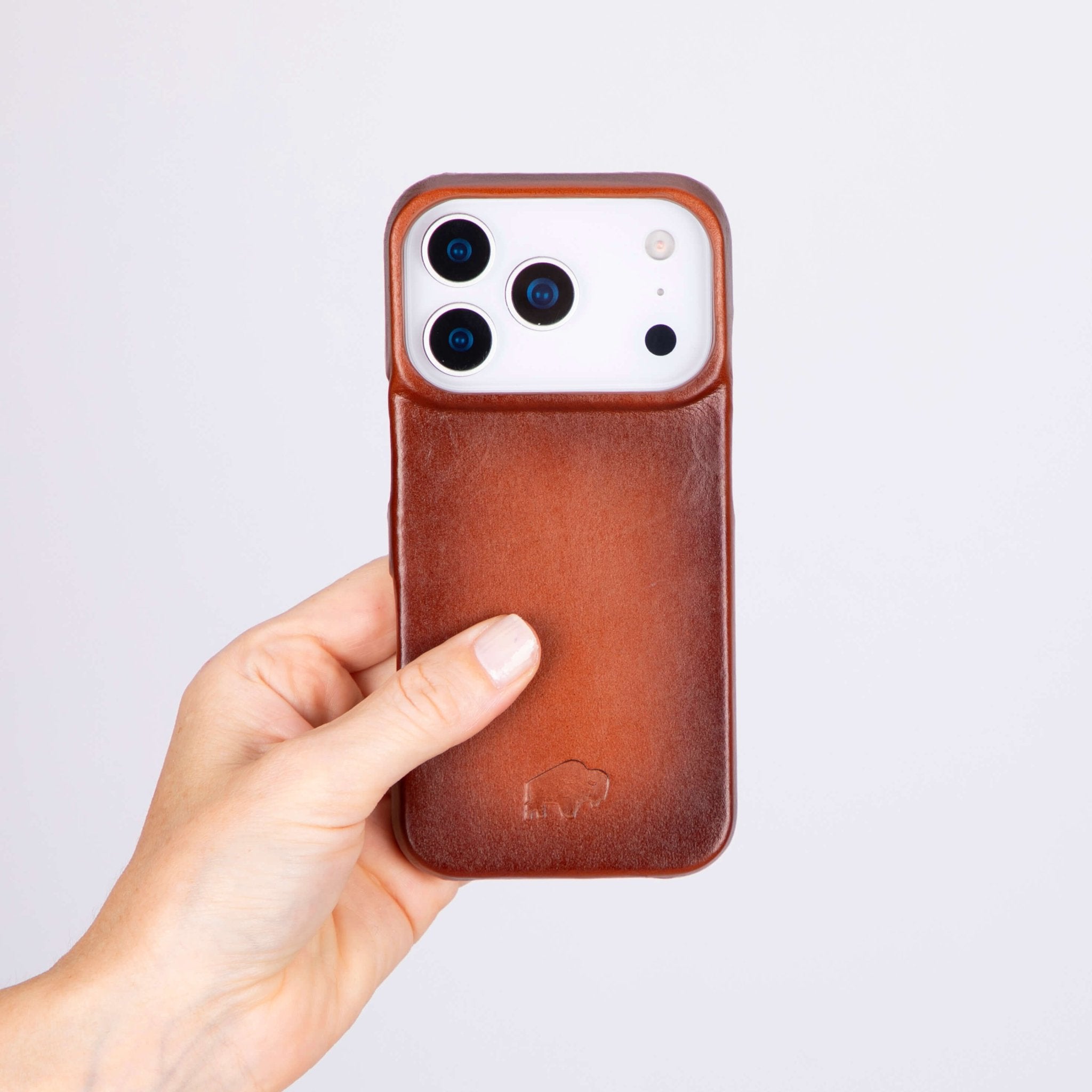 Slim snap-on full-grain leather case for iPhone 17 Pro. Compatible with MagSafe and Qi wireless charging. Raised edge for everyday screen protection.