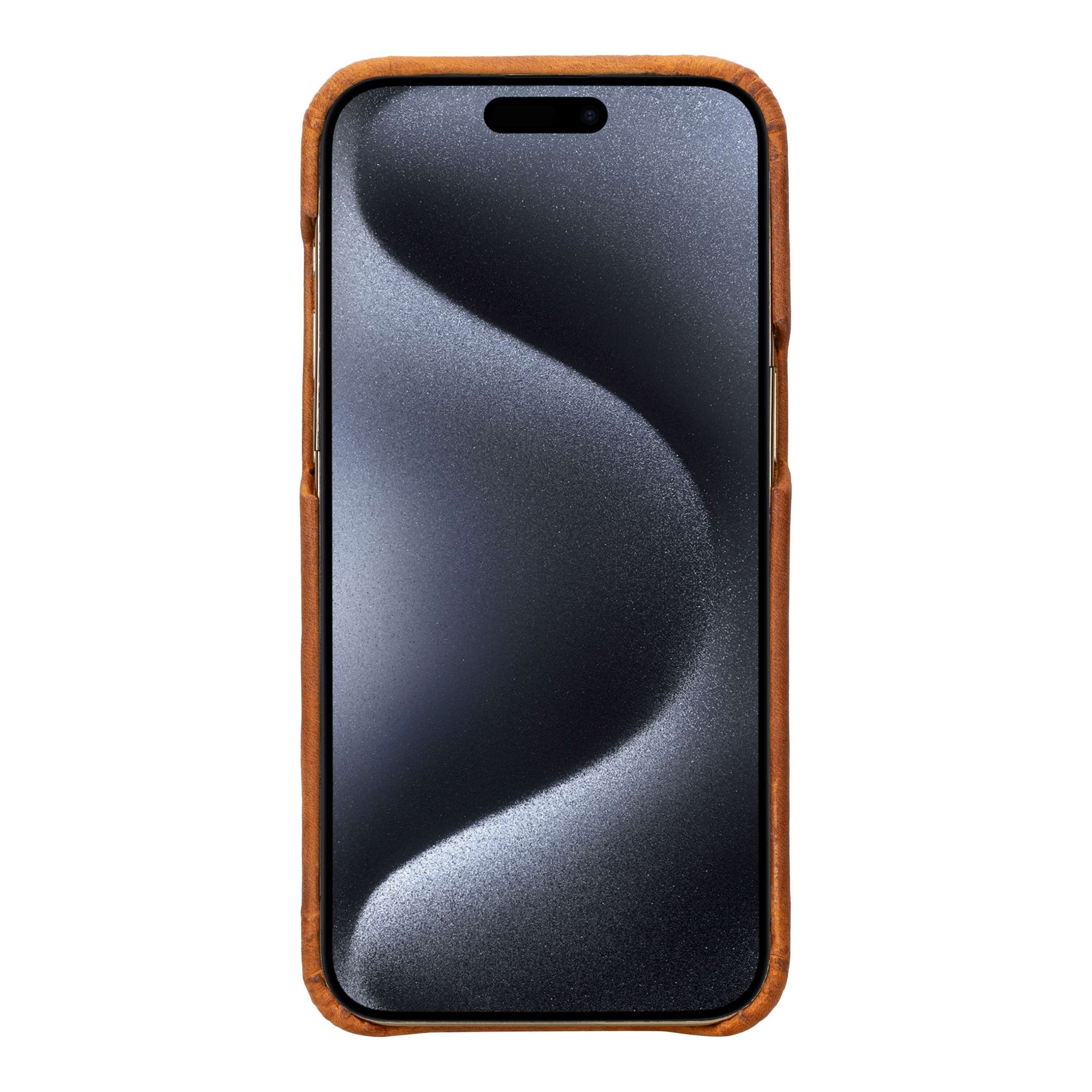 Slim snap-on full-grain leather case for iPhone 15 Pro. Compatible with MagSafe and Qi wireless charging. Raised edge for everyday screen protection.