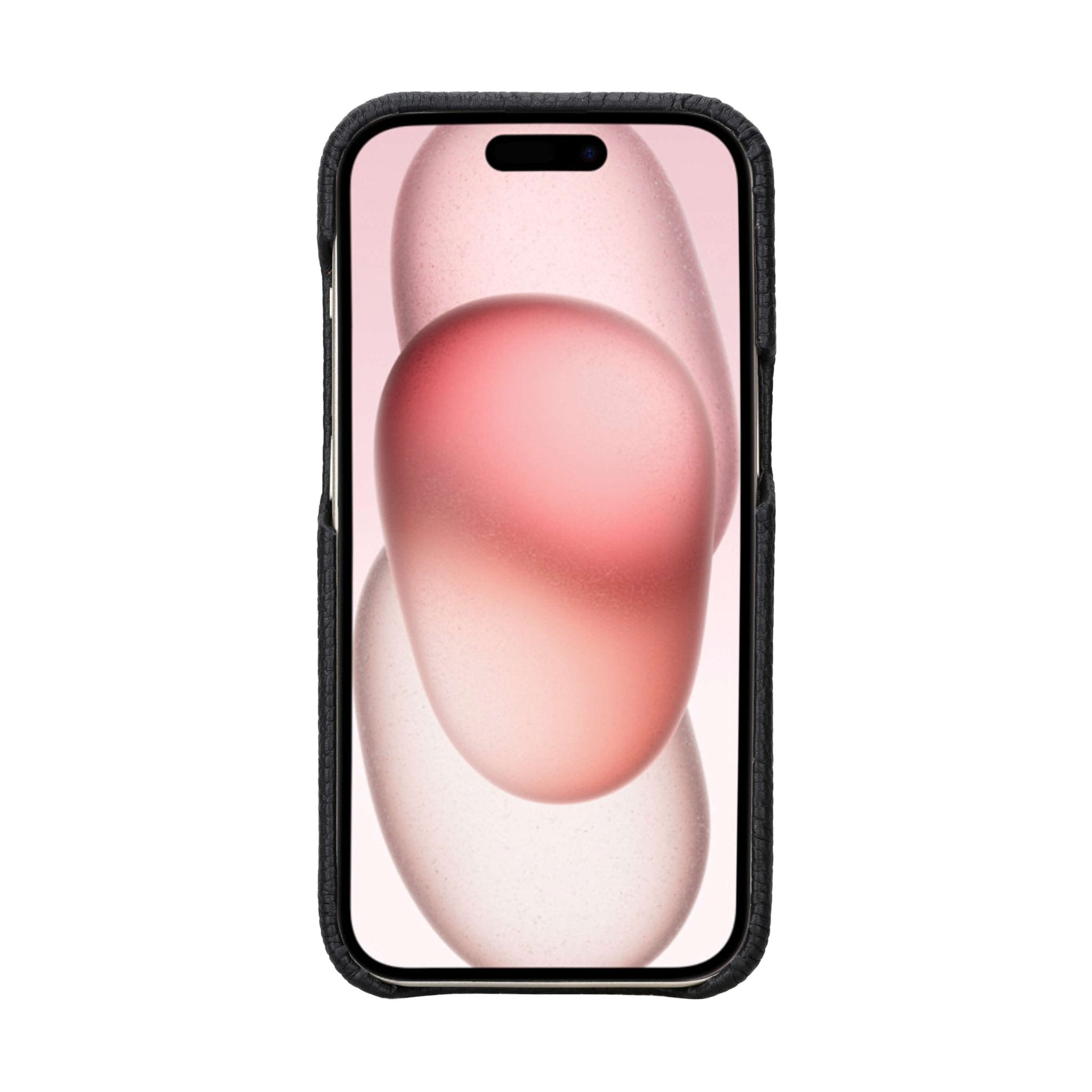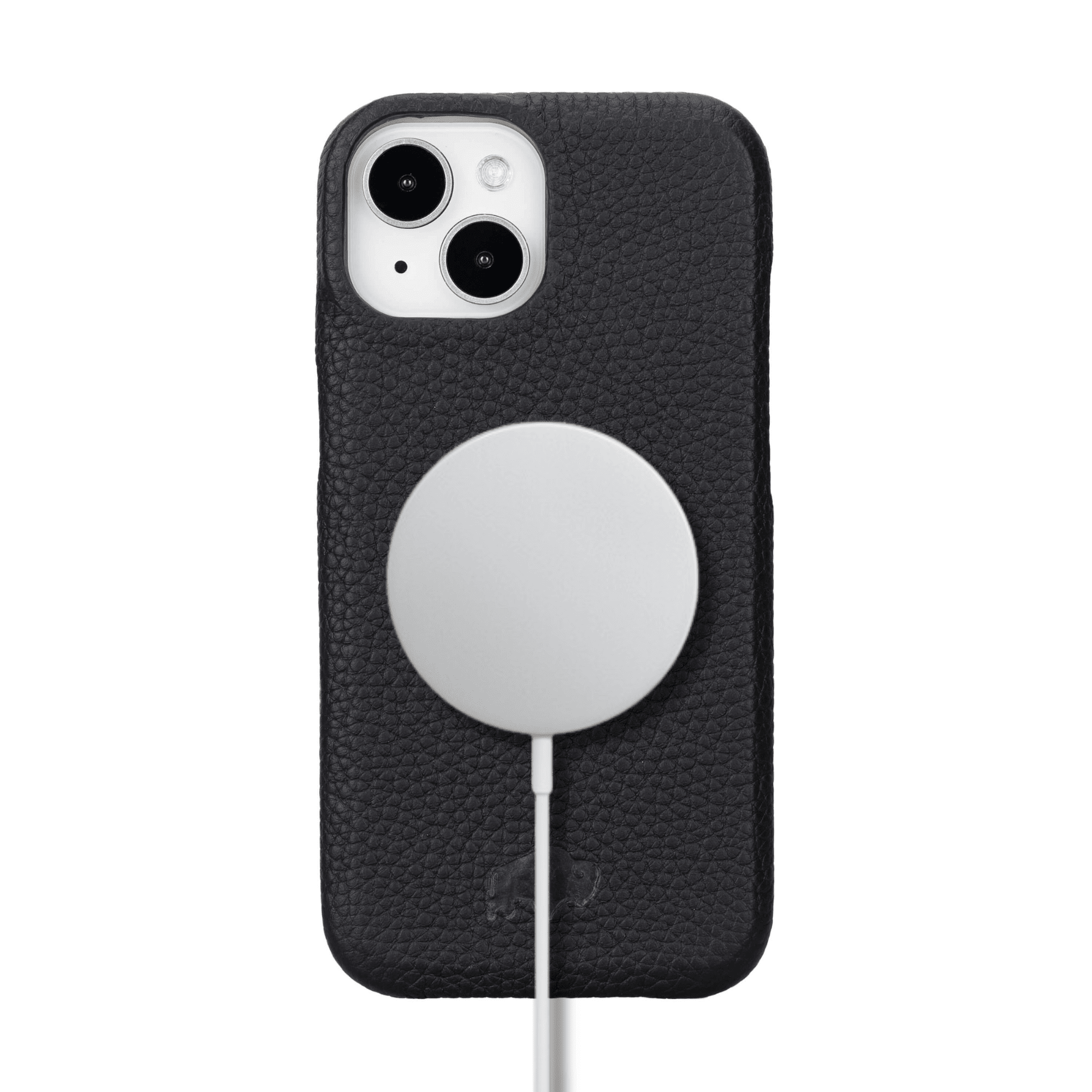 Slim snap-on full-grain leather case for iPhone 15 Plus. Compatible with MagSafe and Qi wireless charging. Raised edge for everyday screen protection.