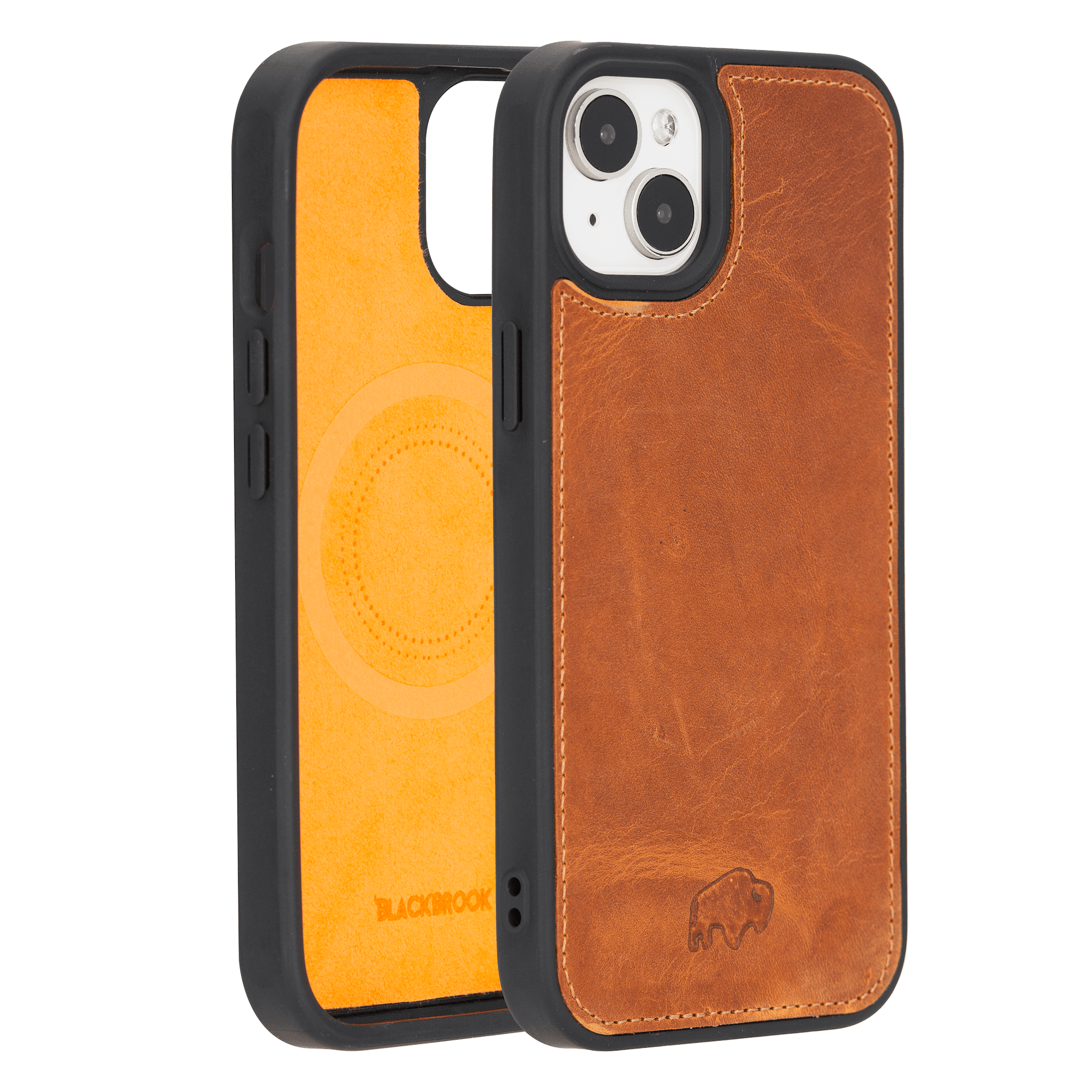 Leather snap-on case for iPhone 15 Plus with a shock-absorbing TPU bumper for everyday drop protection. Finished with full-grain leather, MagSafe compatibility, and dual lanyard attachment points.