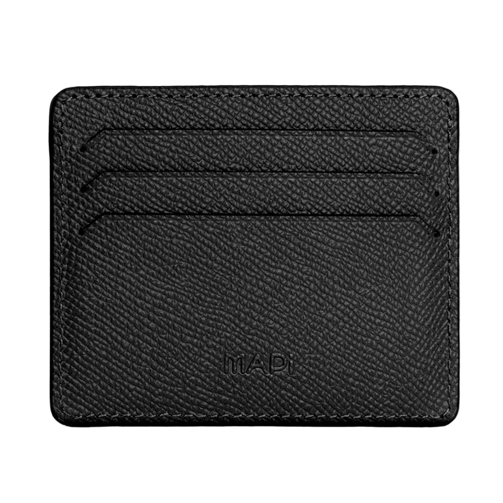 Hand-made slim leather card holder with four rounded slots and a bill compartment.