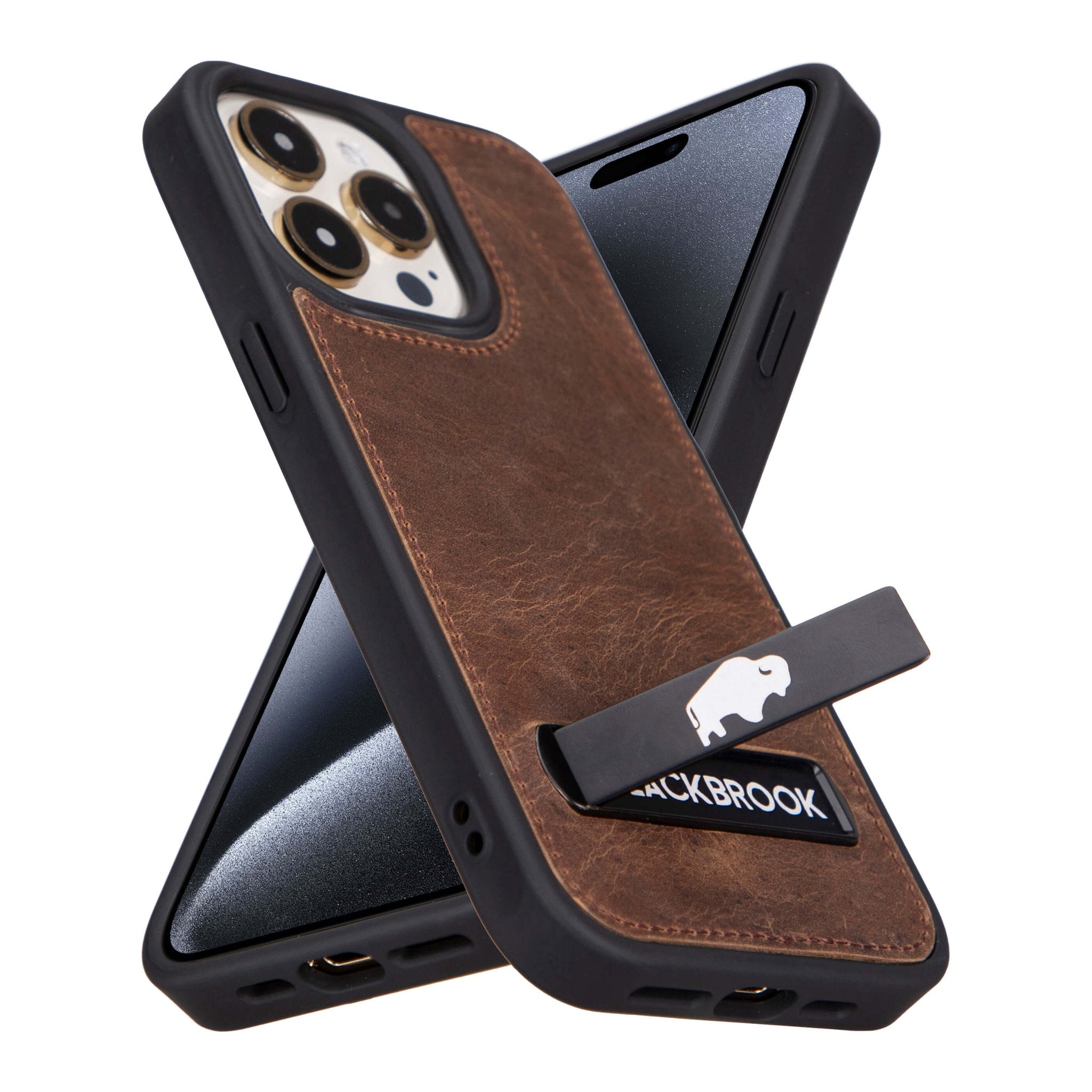 Enhance your Apple iPhone 15 Pro Max with our Reed Snap-On with Stand Case, combining style and protection in a luxurious full-grain leather design. This case offers both a premium touch and robust protection.
