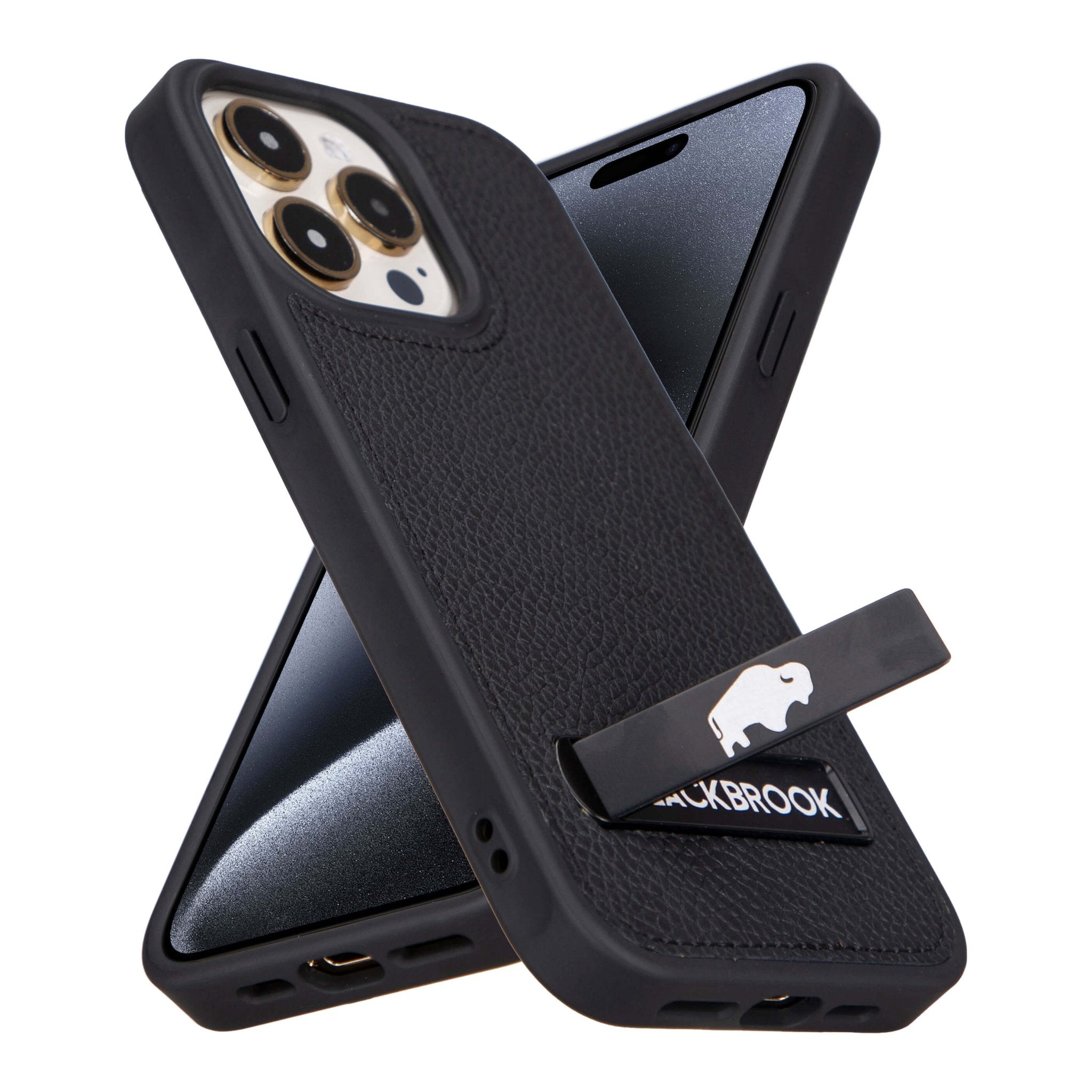 Leather snap-on case for iPhone 15 Pro Max with a built-in kickstand, reinforced sides, and MagSafe compatibility. Designed for hands-free viewing and everyday protection.