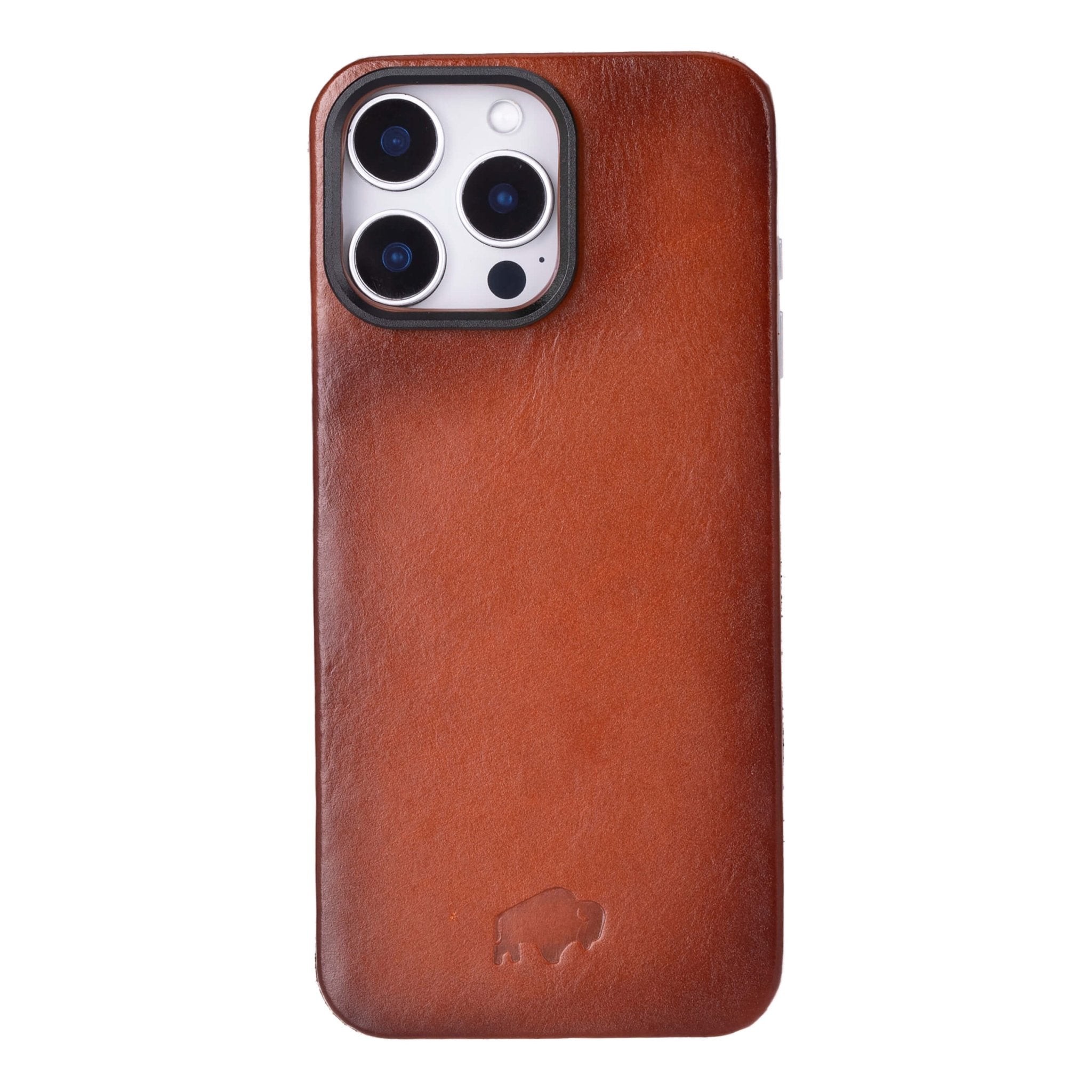 Ultra-thin full-grain leather back case for iPhone 16 Pro Max with MagSafe compatibility and a raised metal camera ring. Designed to add discreet protection while preserving the iPhone’s original feel.
