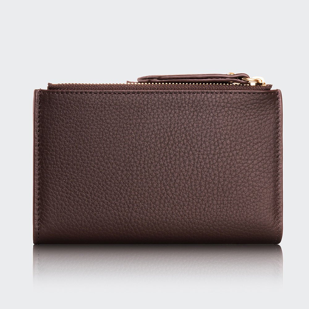 Compact two-pocket wallet with magnetic closure and dual coin zips, crafted in premium leather.