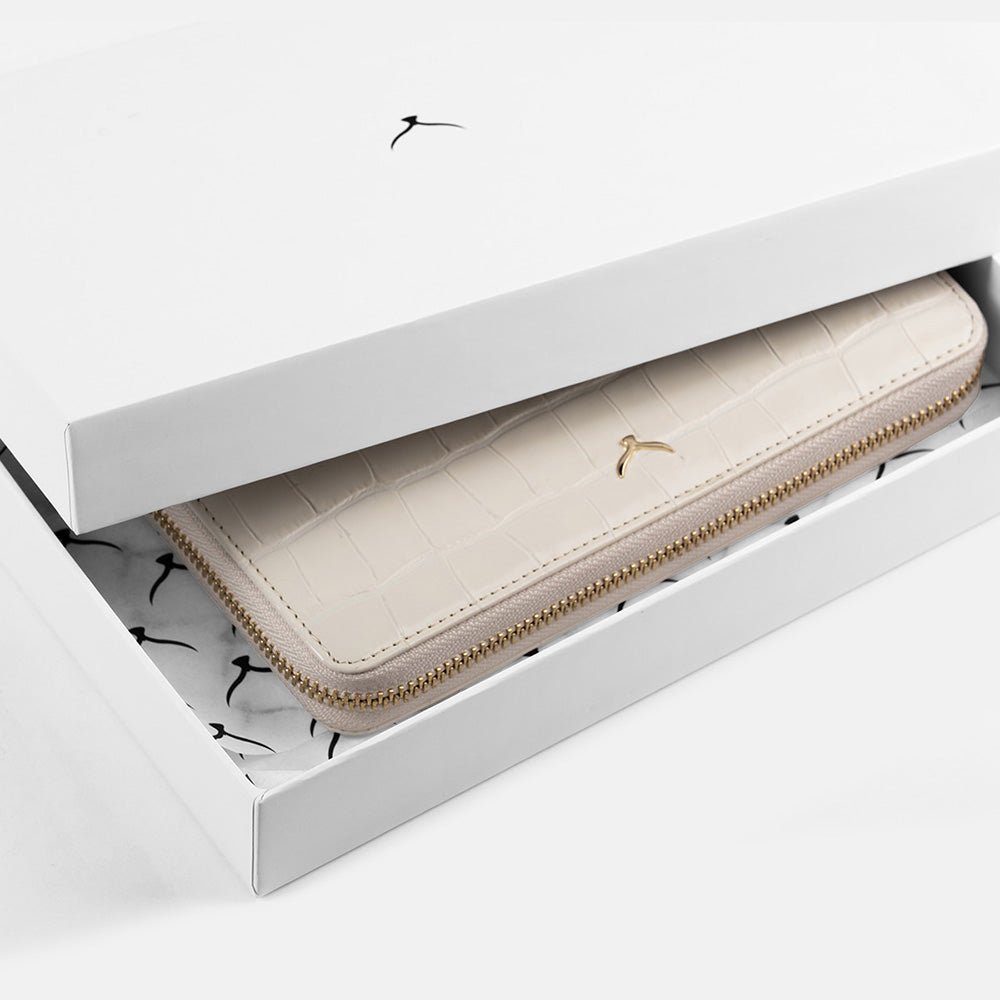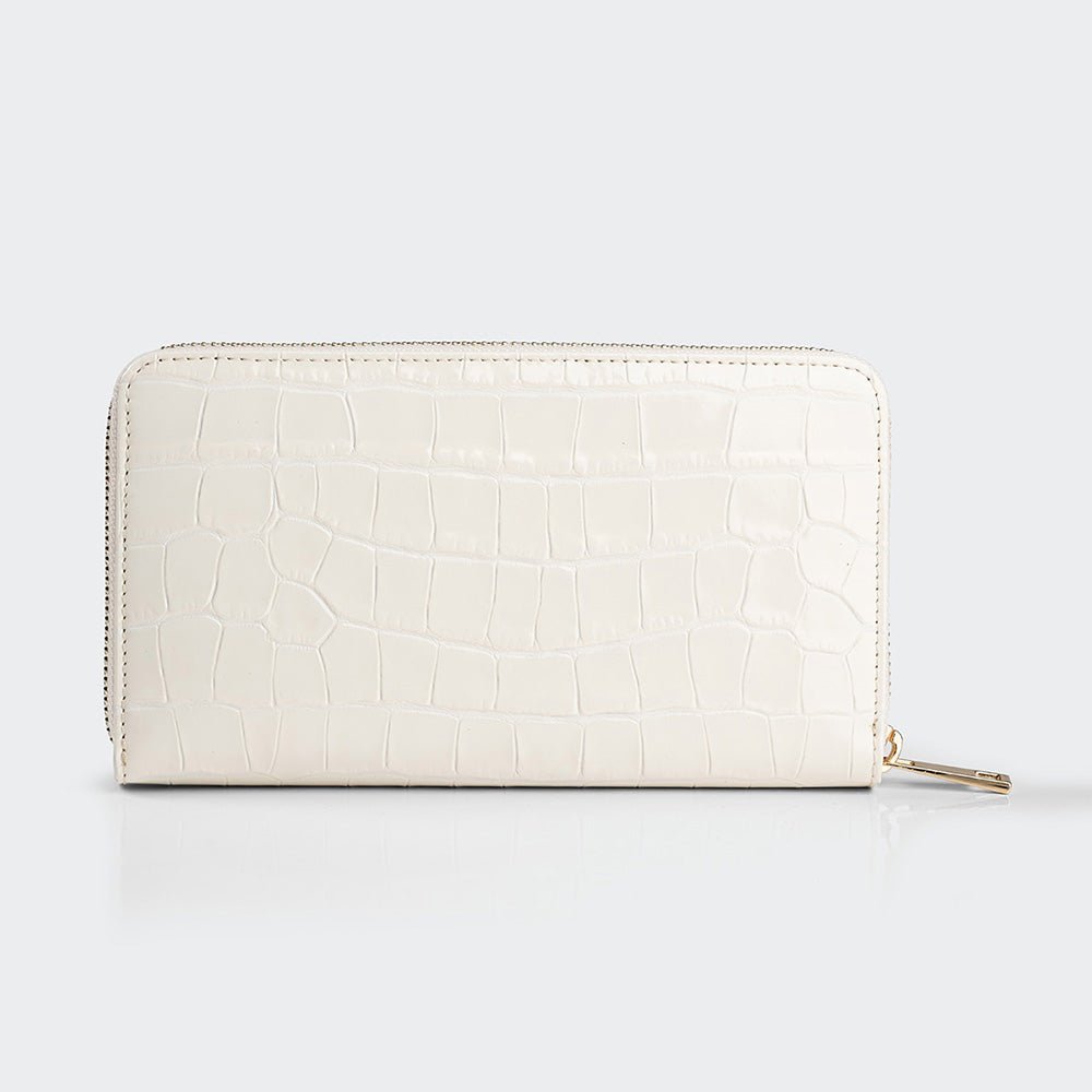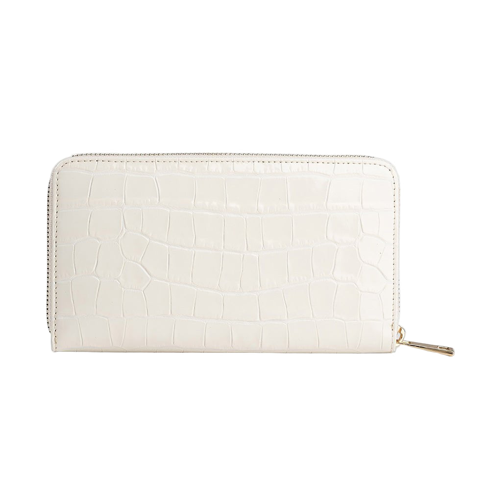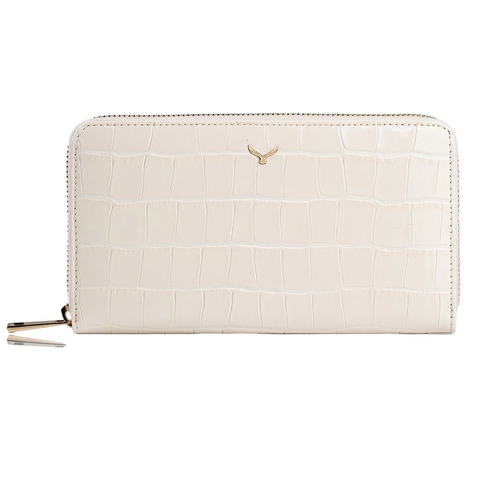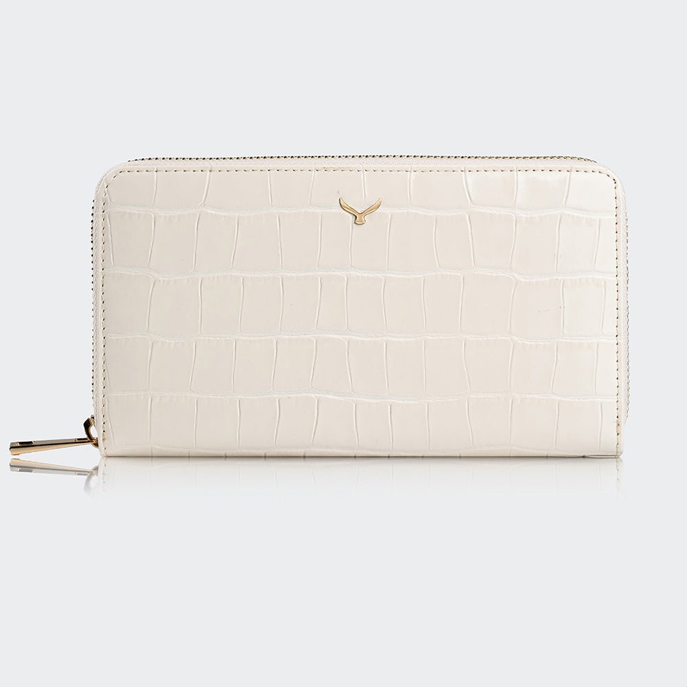 Hand-made leather wallet in croco print with 12 card slots, triple compartments, and secure zip coin pocket.