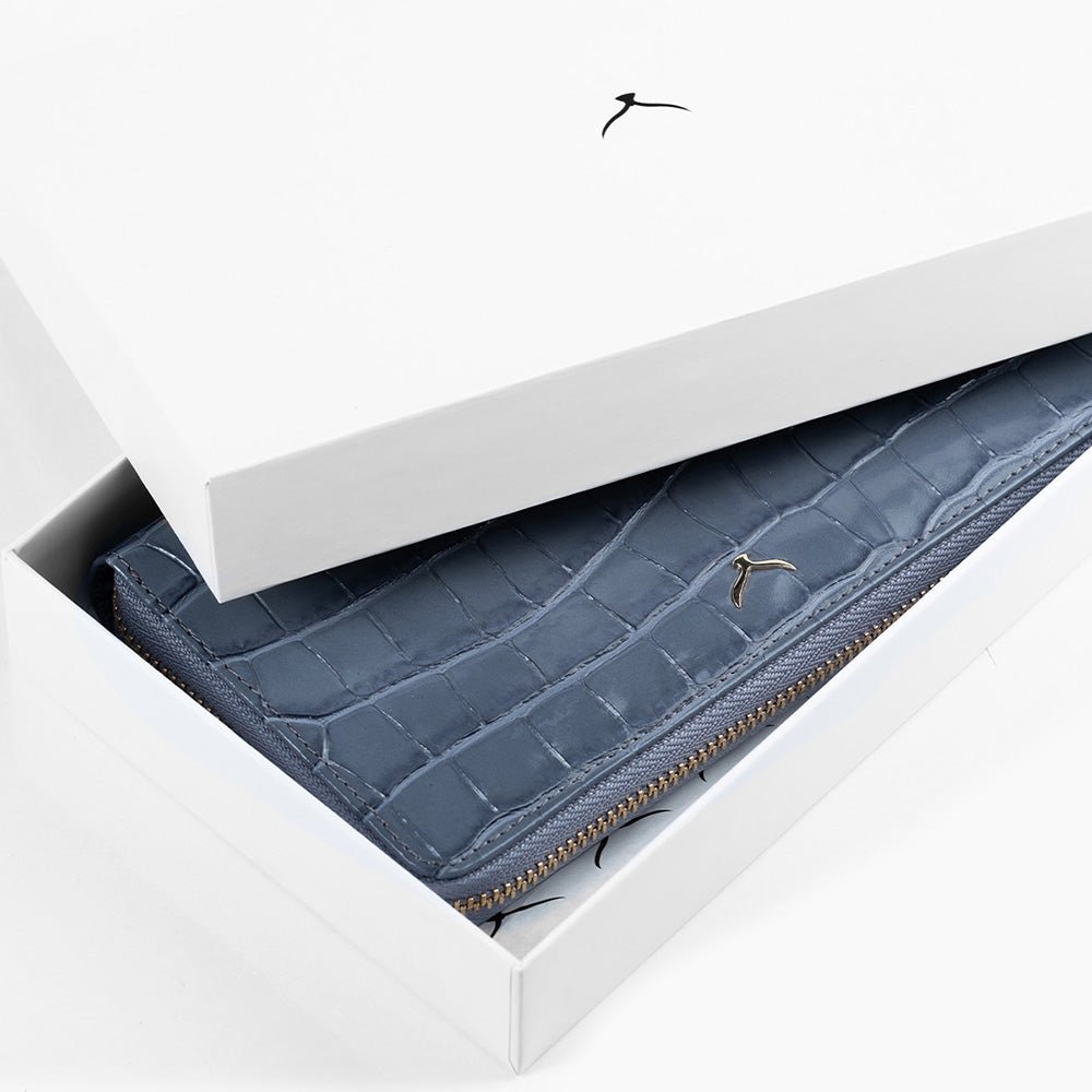 Hand-made leather wallet in croco print with 12 card slots, triple compartments, and secure zip coin pocket.