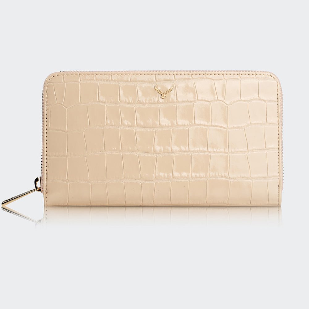 Hand-made leather wallet in croco print with 12 card slots, triple compartments, and secure zip coin pocket.